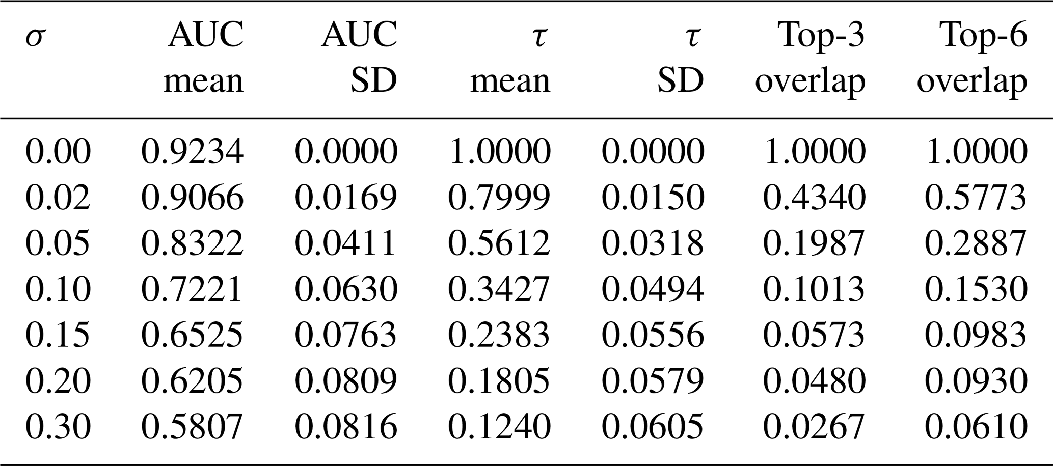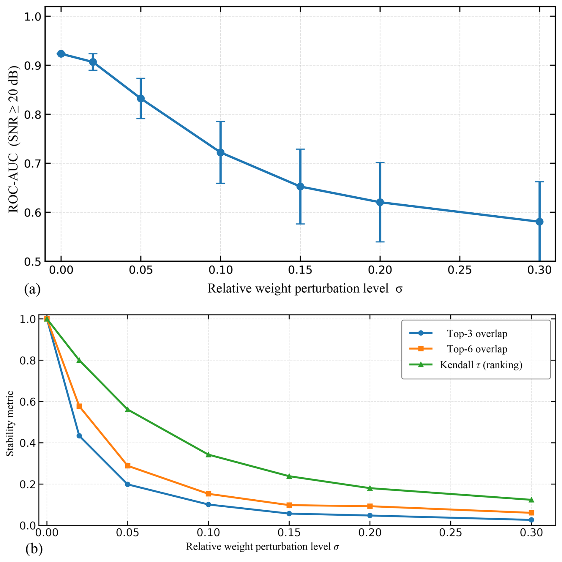 Figure 7Robustness of detectability prediction under weight perturbations. (a) ROC-AUC for dB under weight perturbations. (b) Ranking stability: top-K overlap and Kendall τ versus σ.