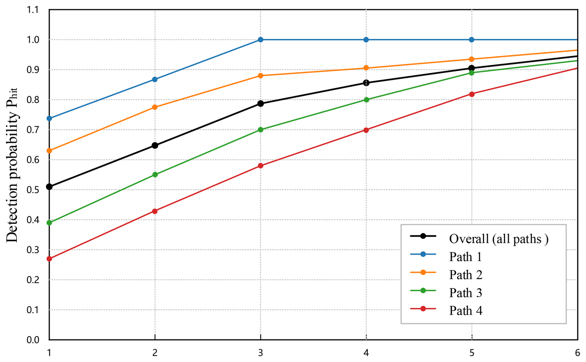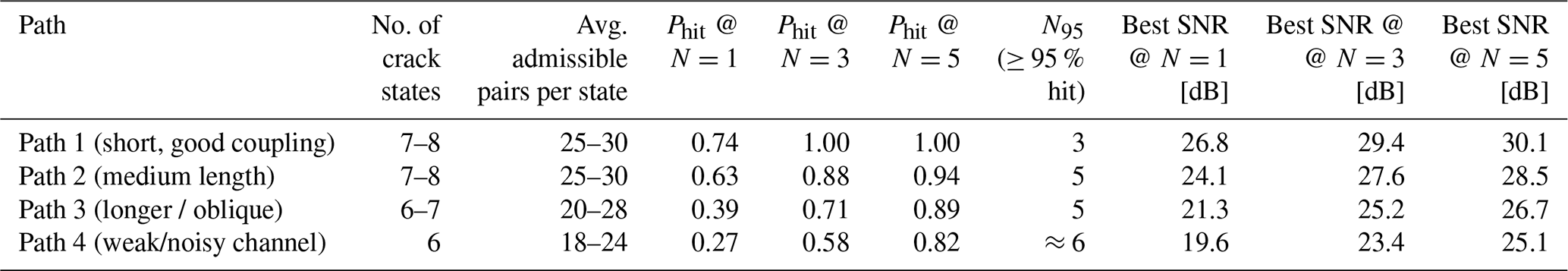 Table 4 reports the same analysis per path. Paths with longer propagation or slightly poorer coupling naturally start from a lower Phit(1), but all of them converge to high reliability once three to five of the lowest-J pairs are exercised. This path-by-path view is important for operators: it shows that a fixed shortlist size can be prescribed a priori (e.g. “always fire top 4”) without re-tuning the selection strategy for each sensor line.
