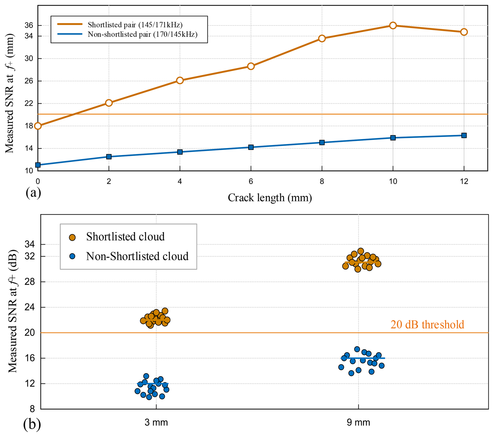 Figure 9Crack growth sensitivity and repeatability of shortlisted versus non-shortlisted tone pairs. (a) SNR(f+) versus crack length for a shortlisted (low-J) tone pair and a non-shortlisted (medium-J) pair on the same path. (b) Repeatability of SNR(f+) at two representative crack sizes (near-threshold and mid-range).
