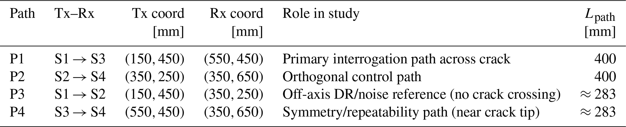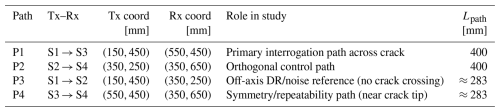 The primary interrogation path P1 (S1 → S3) crosses the crack ligament and is used for the nonlinear analyses reported in Sect. 3.2 and 3.3. Additional paths (P2–P4) serve as an orthogonal control path, an off-axis dynamic-range and/or noise-reference path, and a symmetry and/or repeatability path, respectively. The transmitter–receiver pairs, coordinates, nominal path lengths, and qualitative crack crossings are summarised in Table 1.