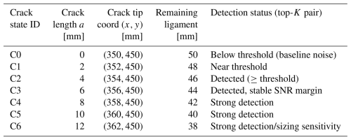 A surface-breaking crack was introduced into the ligament between S1 and S3 and then grown incrementally under controlled loading, producing crack length states C0–C6. For each state, the crack length a, crack tip coordinates, and remaining ligament distance along P1 were measured. All acquisitions were conducted under approximately constant laboratory ambient conditions. For field monitoring, the same short calibration sweep used to estimate Grx(f+) and DRpen can be executed periodically to track hardware drift (including temperature-related changes) under identical acquisition settings. The nominal sequence is reported in Table 2; these crack states form the crack length axis in the SPI-4 crack growth analysis of Sect. 3.3.