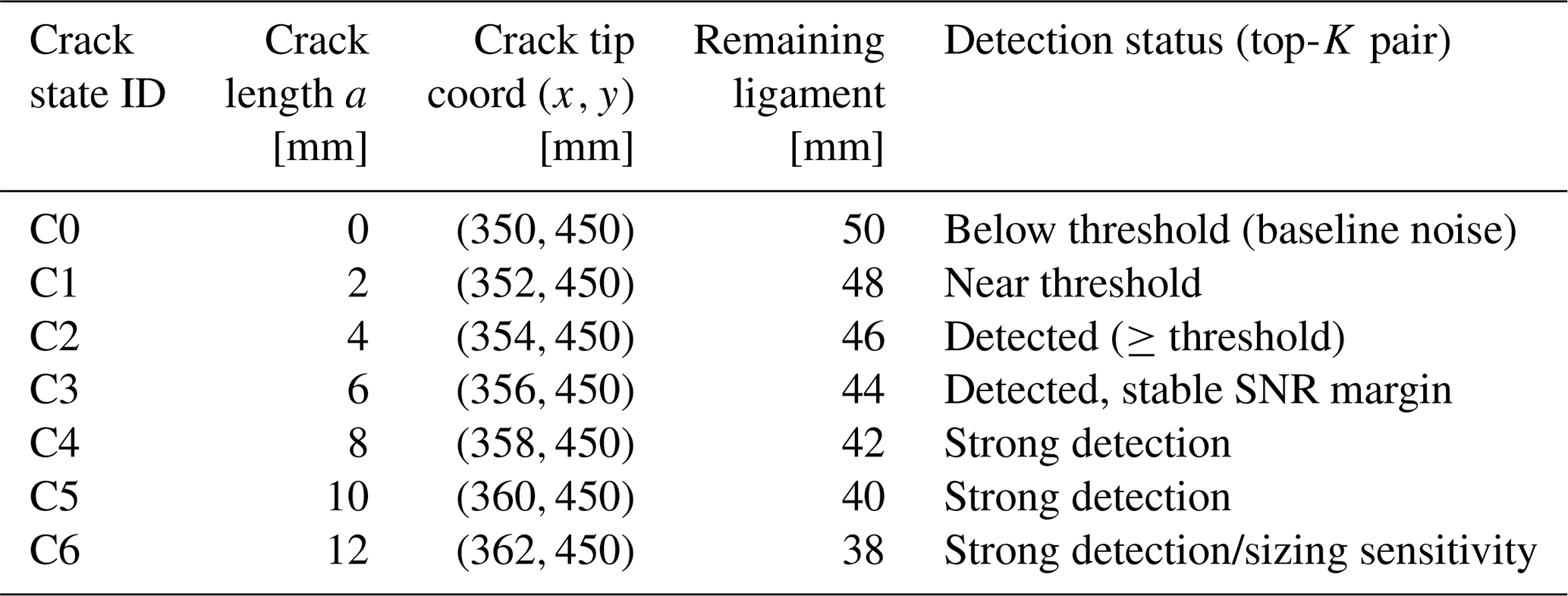 These results extend the conclusion of Sects. 3 and 4.1. The same low-J pairs that rank highest in detectability are also the pairs that (i) cross the detection threshold earliest, (ii) provide the steepest growth-to-response conversion, and (iii) do so with repeatability better than 2 dB under re-acquisition. This combination of early crossing, steep slope, and low scatter is what makes the selection rule usable for in-service monitoring, where operators will not be able to re-optimise tone pairs for every small crack increment.