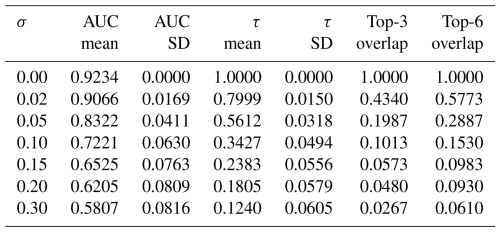 We further examine the sensitivity of this global trend to the weight vector in J. Starting from the default uniform setting ωi=1, we apply relative random perturbations with and recompute the ranking. Figure 7a shows that the detectability–prediction area under the curve (AUC) degrades gracefully with increasing σ, while Fig. 7b and Table 3 summarise shortlist and ranking stability. These results indicate that the conclusions in Fig. 6a are not driven by a finely tuned weight choice.