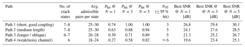 Table 5 summarises the performance of the proposed selection scheme over all inspected S → R paths. Despite noticeable differences in path length and coupling, two features are consistent. First, the ranking generalises: for well-coupled, short paths, exciting only the top-3 lowest-J tone pairs already yields a hit probability close to 1.0; for the less favourable paths, extending the shortlist to three to five pairs restores the hit probability to above 0.8–0.9 while keeping SNR(f+) clearly above the 20 dB detection line. Second, the repeatability penalty on difficult paths is modest (only ∼1 dB larger within-state scatter than the best path), and so the growth-related increments reported in Sect. 4.3 remain observable.