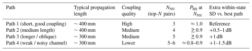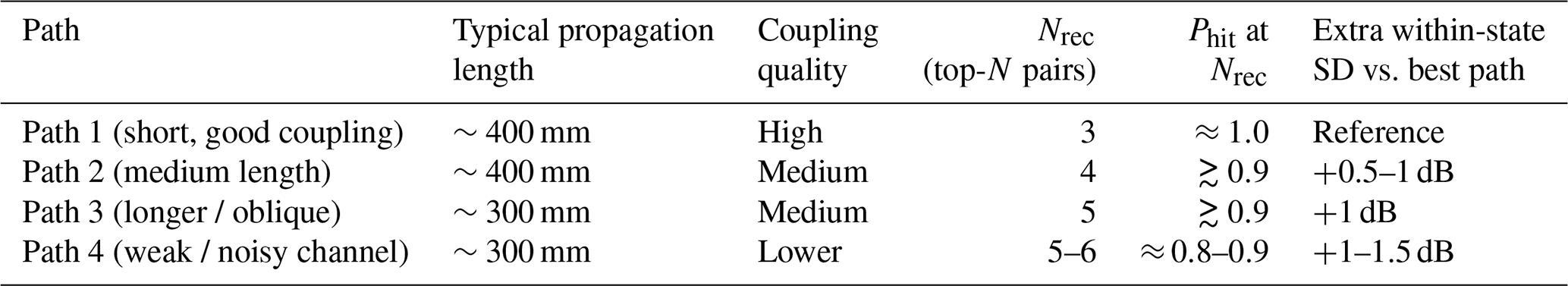 A practical caveat is that very long or strongly reflective paths may require a slightly larger shortlist (top 6) or a refreshed receive band estimate, but these appear as outliers in Table 5 rather than as the dominant case.