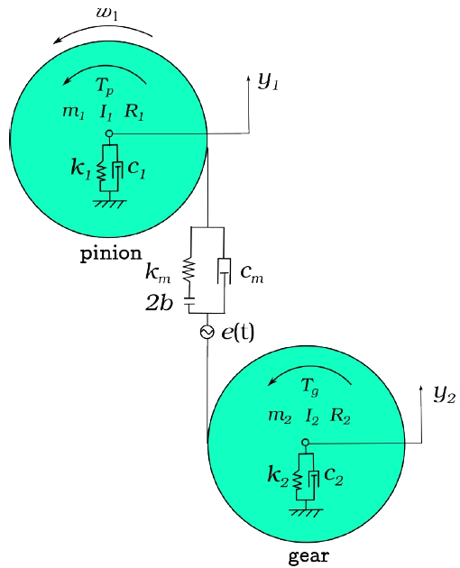 In this model, Tp and Tg are the constant external torques applied to the pinion and gear, respectively. mi, Ii, and Ri (i = 1: pinion; 2: gear) represent the mass, moment of inertia, and reference radius of the two gears, respectively. Fbi is the bearing radial pre-tension, and ki and ci are the equivalent bearing stiffness and damping, respectively. km is the meshing stiffness of the gear pair, cm is the meshing damping of the gear, and 2b is the gear backlash. The basic movements of the system can be described as four DOFs: two reverse movements, θ1 and θ2, and two translational motions, y1 and y2. e(t) represents the static transfer error caused by manufacturing.