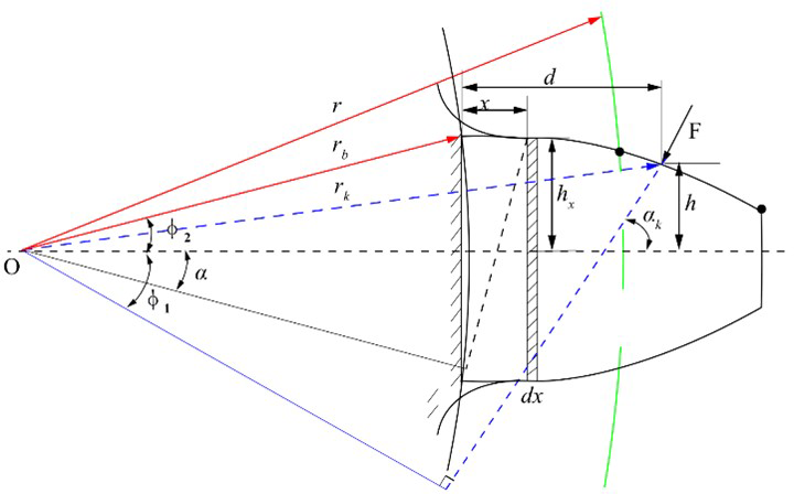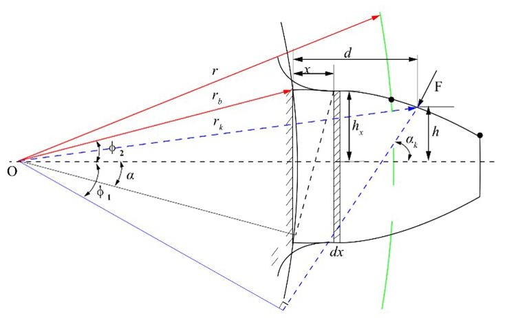 The distance of the meshing point along the tooth height direction is denoted by d. The definitions of d, x, and h are as shown in Fig. 2, and the values of G, Ix, and Ax can be calculated as