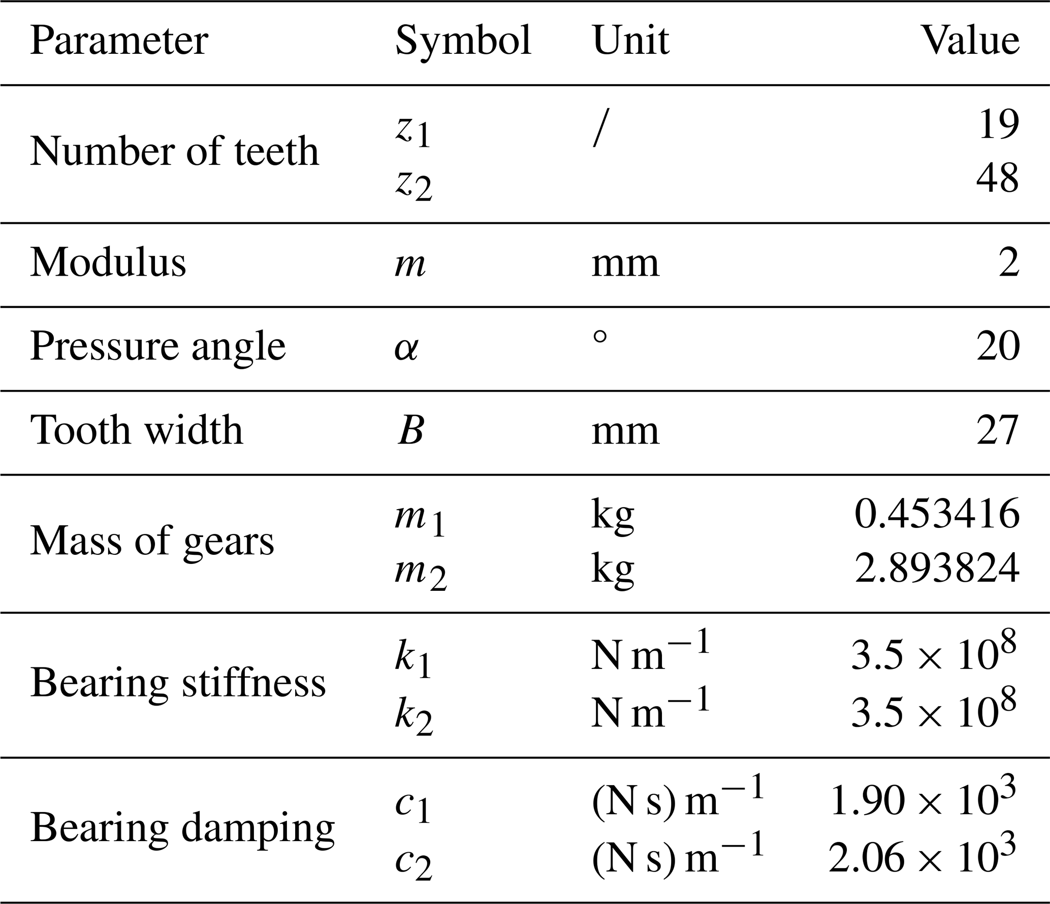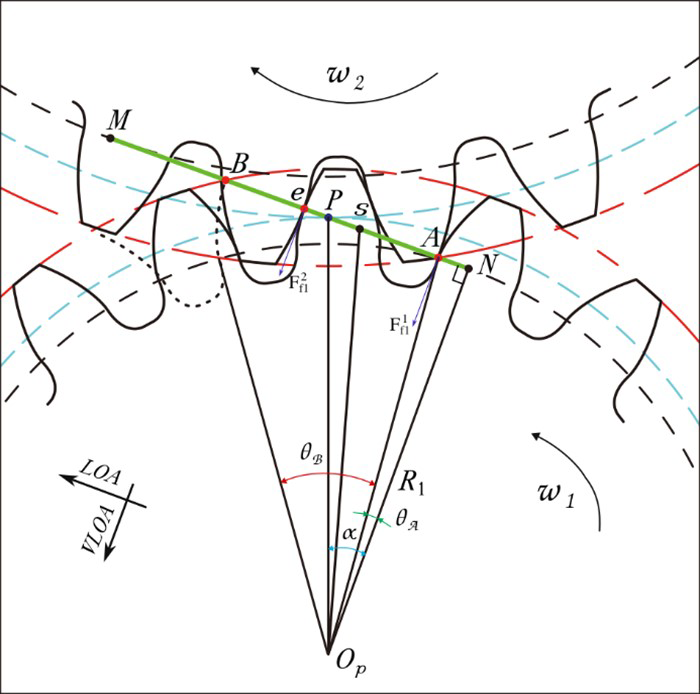 where E is Young's modulus; ν represents Poisson's ratio; L indicates the tooth width; Sf expresses the tooth thickness on the root circle occupied by the angle 2θf; ε = , where Rf is the radius of the root circle and rin is the radius of the hub bore; and L∗, M∗, P∗, and Q∗ are parameters depending on ε and θf. Further details are discussed elsewhere (Li et al., 2014). Thus, for single-tooth contact, the total effective TVMS can be expressed as