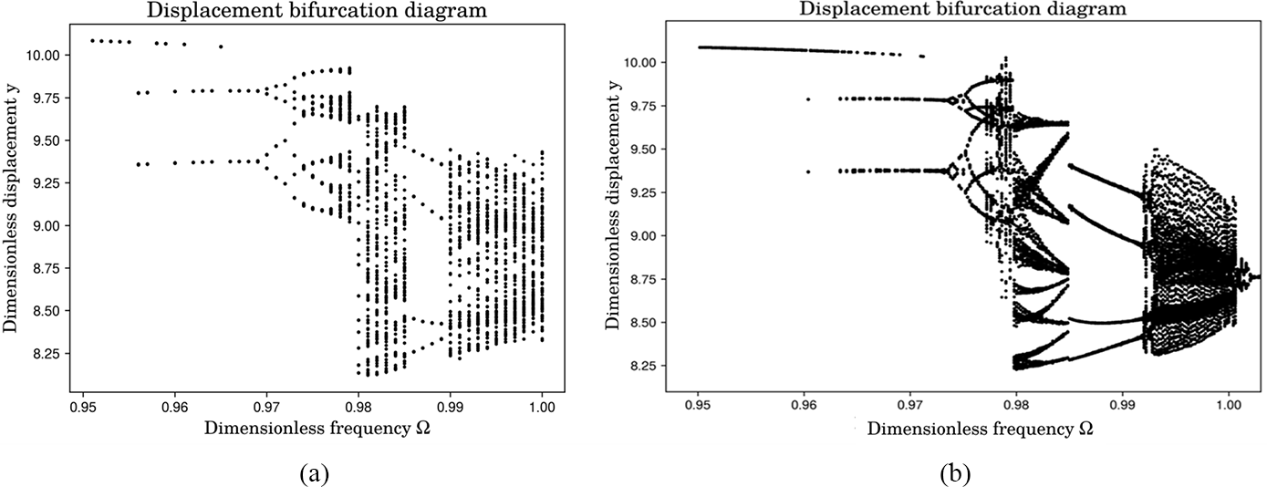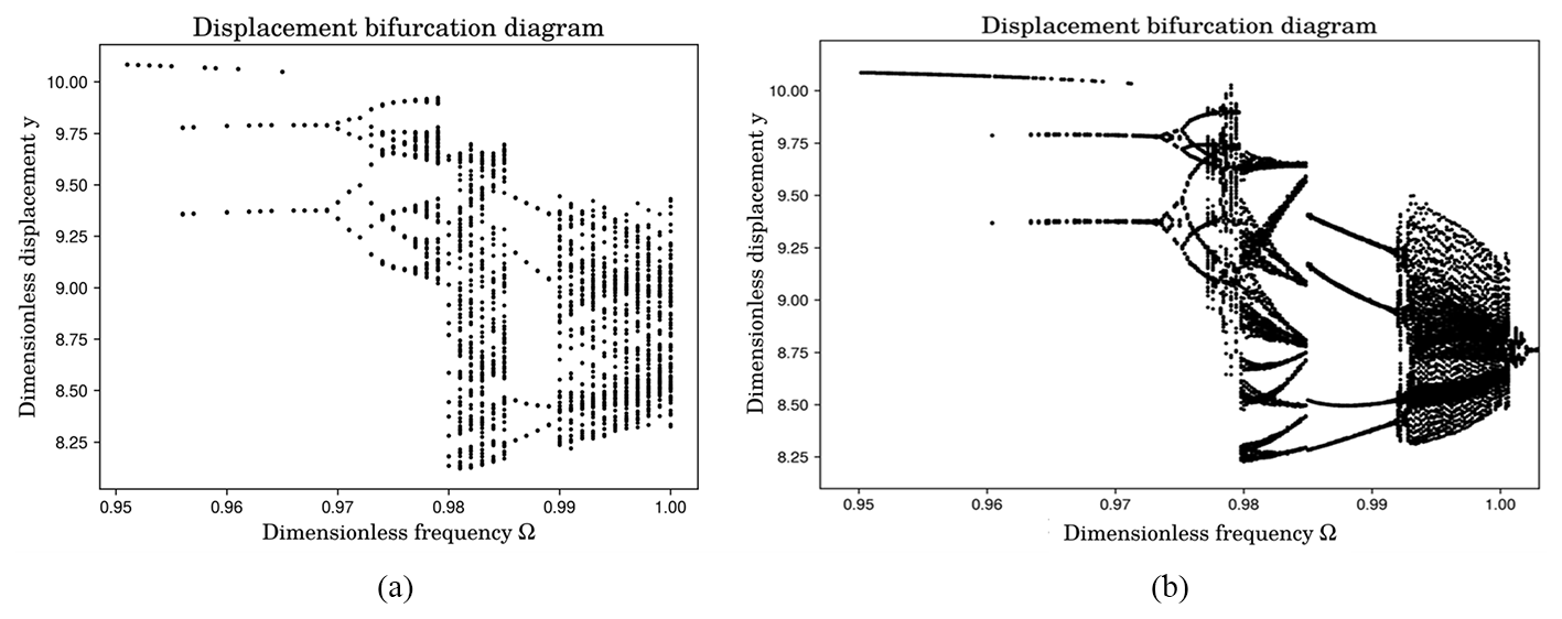 The dynamic response of the system was calculated using the FTTVMS. Figure 6b shows the graph corresponding to the case of using the FTTVMS. The periodic-motion characteristics and bifurcation points of the system exhibited significant differences compared with the original data. The bifurcation point at which the system changed from two-fold periodic to four-fold periodic motion changed from 0.969 to 0.974, and the evolution time from periodic to chaotic motion decreased. The chaotic motion of the system exhibited significant quasiperiodic changes in the range of (0.979, 0.984), and the four-period motion range generated in the chaotic motion of the system increased from 0.003 to 0.008.