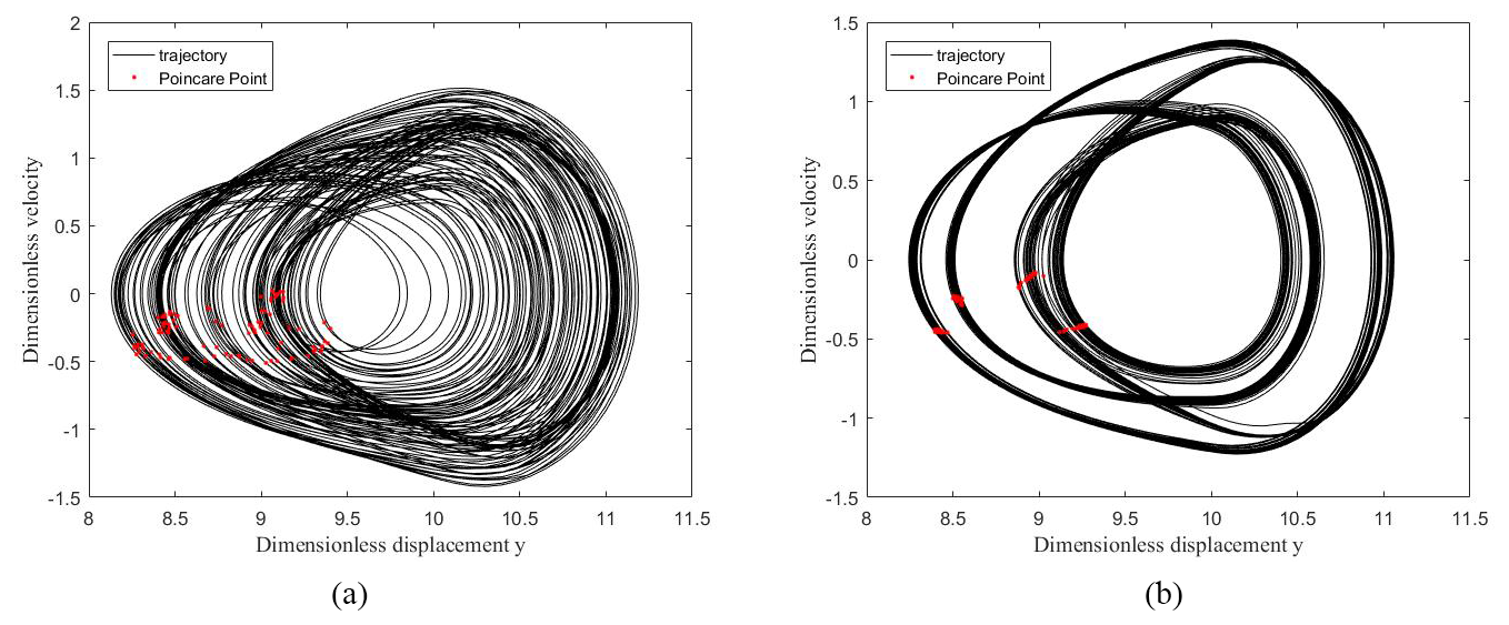 As shown in Fig. 7, the Poincaré points were visualized in a phase diagram generated by solving for 100 steady-state periods. Figure 7a and b show the results obtained using DTVMS and FTTVMS, respectively. When the external excitation frequency was set to Ω = 0.992, the system stiffness was obtained via Fourier transformation, leading to a significant deviation in the predicted system response.