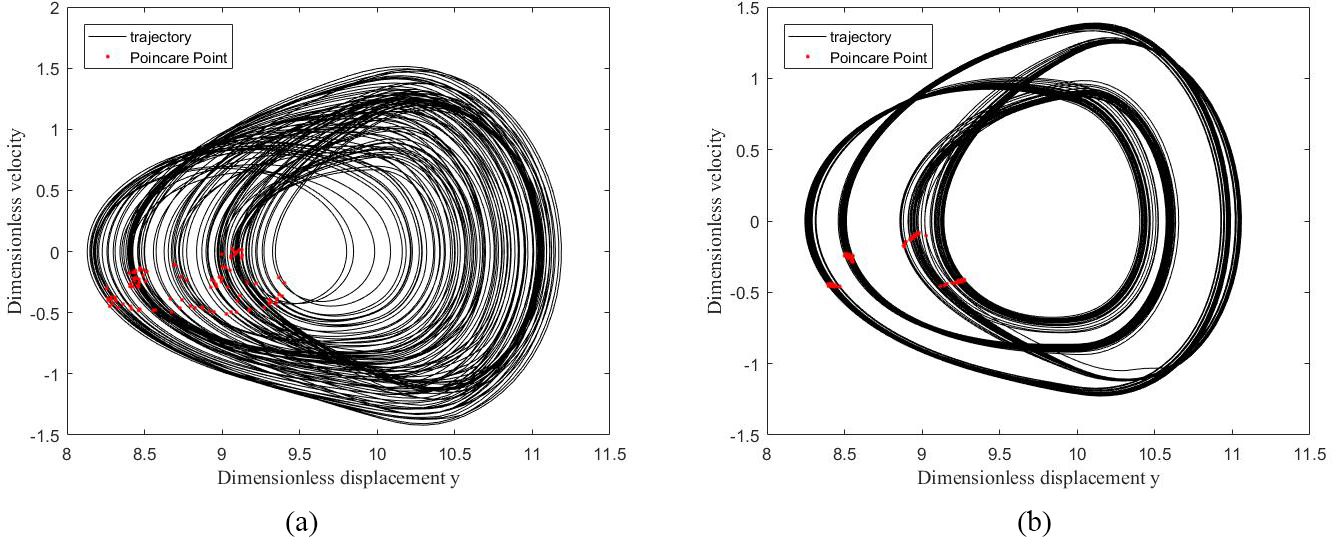 The dynamic response of the system for the quasiperiodic- and chaotic-motion states is shown in Fig. 10, which reveals that, in contrast to the periodic motion, the system-level detachment time increased during the quasiperiodic- and chaotic-motion stages. Furthermore, its chaotic reaction became more chaotic when discontinuous TVMS was considered. Its external excitation frequency was low at low speeds, and P-1 motion was observed. The dynamic properties of a system can be accurately predicted using the Fourier fitting approach. However, its stable periodic motion became more complicated as the rotational speed increased.