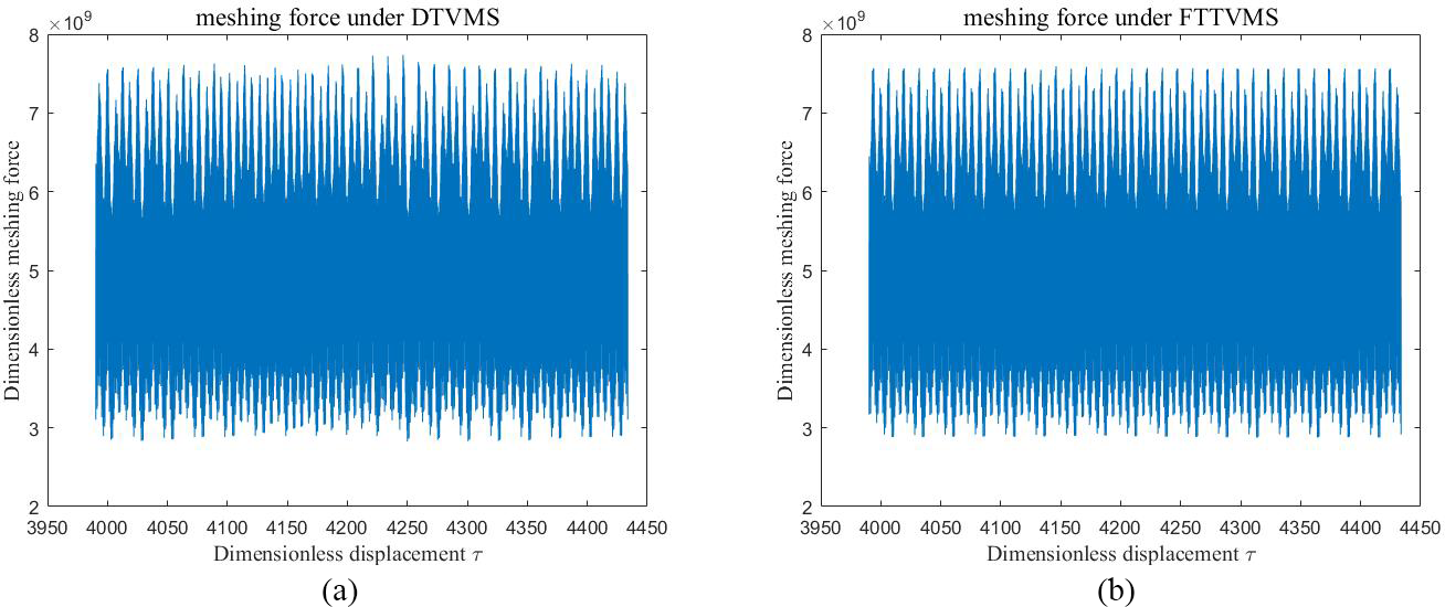 Furthermore, the dynamic meshing force of the system was calculated. As illustrated in Fig. 8, the peak value of the dynamic meshing force determined using DTVMS was higher than that obtained using FTTVMS. These results highlight the critical engineering and practical implications of accounting for discontinuous TVMS to comprehensively analyze and accurately predict the dynamic behavior of gear systems.