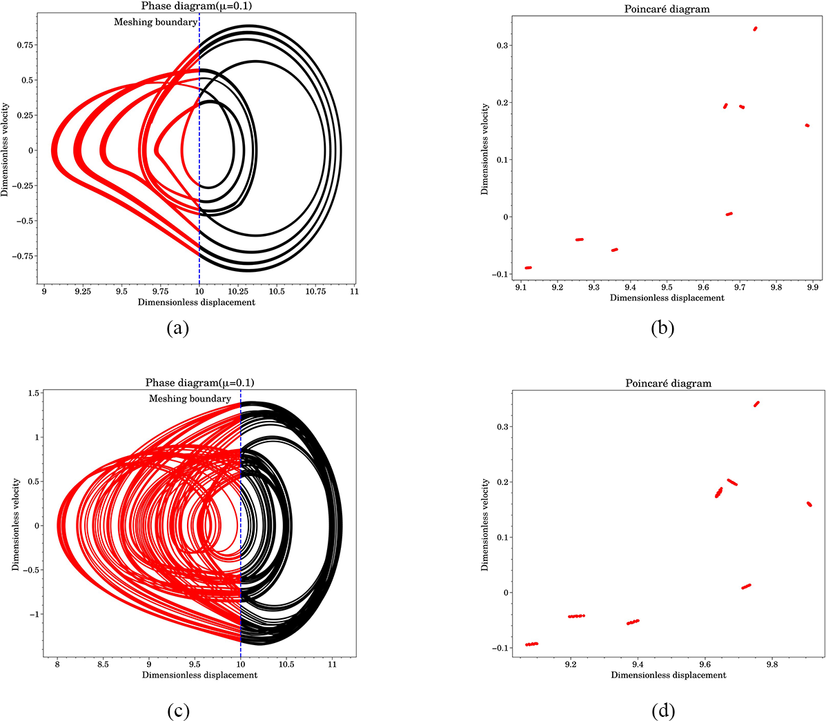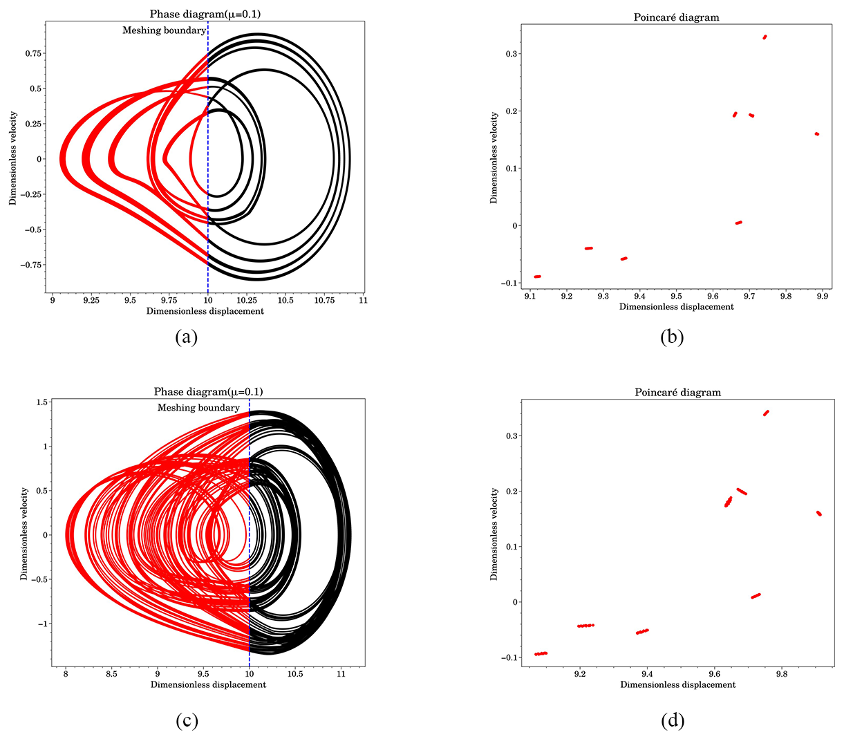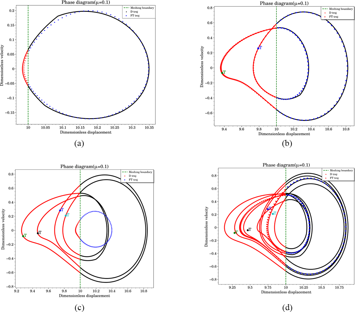 In Fig. 9, the red areas indicate the disengagement state. When the system was in the P-1 or P-2 motion, the TVMS obtained using the Fourier transform fit the calculation results using the DTVMS. However, as the speed increased (i.e., the excitation frequency increased) and the system entered a multi-period response state, the response derived using the FTTVMS fitting differed significantly. The phase diagrams in Fig. 9c and d show the response characteristics with a TVMS discontinuity, revealing that the system response period derived through Fourier fitting did not converge.