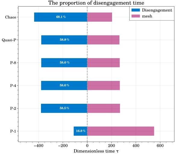 Although the proportion of gear separation was small, the reciprocating motion of meshing and demeshing exacerbated the system shock and vibration. To investigate the adverse effects of different dynamic responses on the disengagement characteristics of the system, the disengagement proportions of period 1, period 2, period 4, period 8, the quasiperiod, and chaos (Fig. 11) were compared and analyzed under different dynamic responses. Figures 9 and 10 show that gear disengagement occurred periodically during periodic motion, whereas gear disengagement was not periodic under quasiperiodic and chaotic motions. To obtain more accurate results, we used 100 000 time periods after removing the transient to calculate the detachment proportion of the aperiodic response (quasiperiodic or chaotic).
