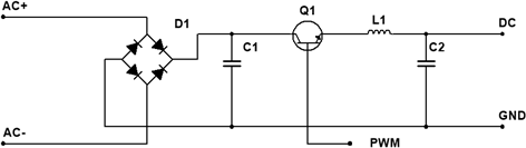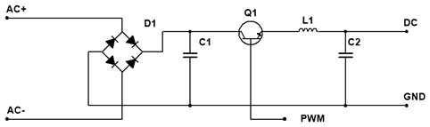 In implementation, the rectifier stage uses a diode-bridge rectifier followed by a DC-link capacitor (C1) to reduce the 50 Hz ripple. The regulated DC bus is then generated by a buck converter using Q1 as the switching device, together with L1 and C2 to form a low-pass output filter. The duty cycle of Q1 is controlled by the microcontroller to adjust the DC bus voltage, which determines the excitation amplitude of the inverter stage.