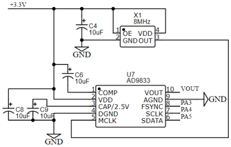 This circuit takes digital control to generate ultrasound signals. With the choice of the AD9833 programmable waveform generator, the generator can produce high-precision square-wave outputs. When the main frequency clock is set to 25 MHz, we can achieve a 0.1 Hz resolution output signal; the main frequency clock of 1 MHz can achieve a 0.004 Hz resolution output signal, and the use of three serial interfaces to write data is easy for the microcontroller chip to use in relation to its control. This article uses Altium Designer to draw the ultrasonic power drive control circuit (Fig. 4).