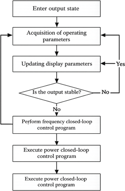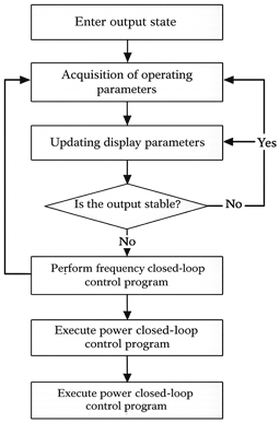The stabilized output of the ultrasonic power supply is mainly realized by two closed-loop control systems. (1) Power closed-loop control design uses the duty cycle of the PWM (pulse width modulation) signal to adjust the equivalent output voltage of the switching tube, and the output voltage is stabilized and the noise is reduced to obtain the controllable output power. The amplitude of the output voltage is changed to ensure the stabilization of the current flowing through the two ends of the transducer. (2) Frequency closed-loop control design entails collecting the voltage and current at the end of the transducer and its phase difference to be able to calculate the resonant frequency of the ultrasonic vibration system based on the system in order to realize the frequency search and tracking. Therefore, according to the above ideas, this paper adopts the ultrasonic power control program block diagram shown in Fig. 5.