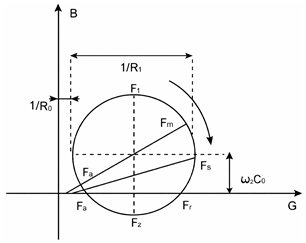 When the phase vector terminal of Y1 is rotated by 1 week, the phase vector terminal of Y0 is generally small with the frequency change, which is approximated as a constant, and Y0 is a purely imaginary number. Therefore, the trajectory circle of Y1 is translated upward along the longitudinal axis in the complex plane. The trajectory of the phase vector terminals of the total conductance with frequency change can be obtained as shown in Fig. 7, which is the so-called conductance circle.