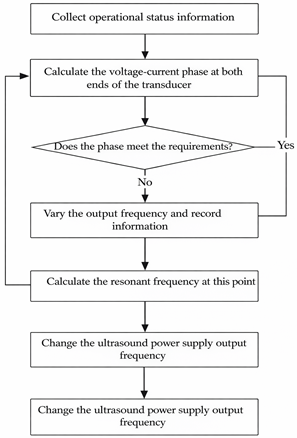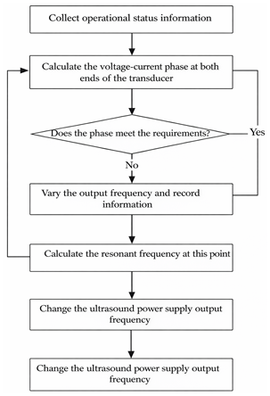 The ultrasonic power supply detection module will collect the voltage and current for comparison of zero (values); when the size of the two becomes zero and the time interval is very small, it can be assumed that, at this time, the phases of the two are the same in the state of resonance. When the two over-zero time intervals cannot be ignored, this moment is not in a resonance state, and so the need to adjust the output frequency in relation to the transducer resonance state arises. At this time, one can use the operating conditions collected by this method to calculate the resonant frequency at this moment and to change the output frequency of the ultrasonic power supply so that it remains in the resonant output state. The flow of output frequency tracking of the ultrasonic power supply is shown in Fig. 8.