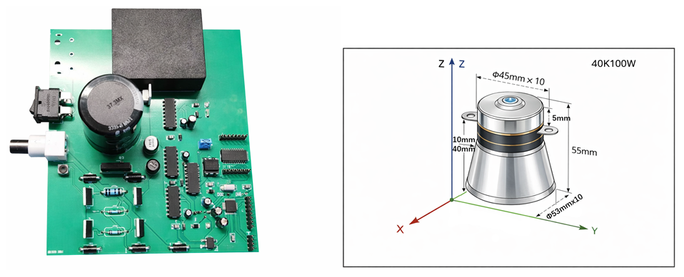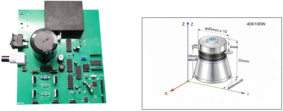 Figure 9Fabricated power supply (left) and used ultrasonic transducer (right). The transducer is rated at 100 W/40 kHz and employs a hard PZT ceramic stack.