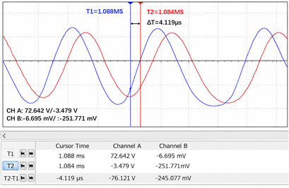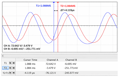 Figure 10The phase difference calculation (CH1 is the transducer terminal voltage, and CH2 is the current-sensing voltage measured across the 1 Ω series resistor).
