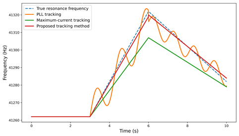 The proposed resonance frequency-tracking method has direct relevance to ultrasonic-machining applications. In ultrasonic machining, the resonant frequency of the transducer can drift due to changes in load, temperature, and material properties. These variations can lead to fluctuations in the ultrasonic power output, affecting machining efficiency and precision. By continuously tracking the resonant frequency in real time, the proposed method ensures stable operation of the ultrasonic system, maintaining consistent power output even under dynamic conditions. This stability is critical for improving the consistency and quality of ultrasonic-machining operations, such as cutting, drilling, and polishing of hard materials.