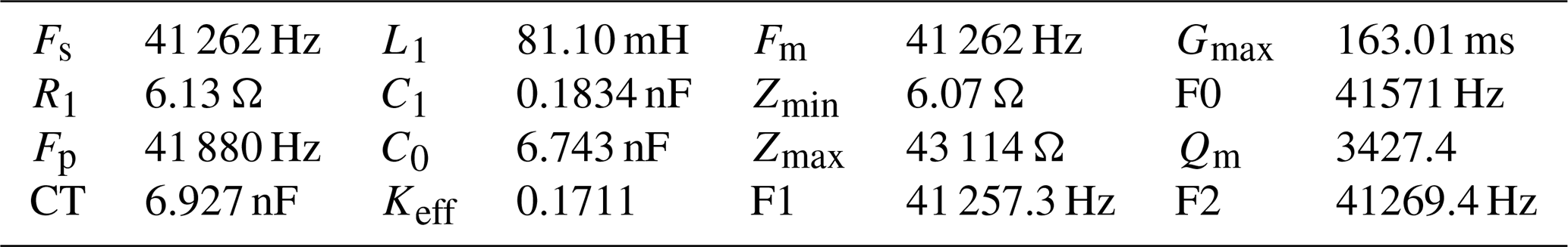 The selected transducer (which adopts a hard PZT (lead zirconate titanate) piezoelectric ceramic stack as the active element for high-power ultrasonic excitation) is designed with a power of 100 W and a frequency of 40 kHz, and the characteristic parameters of the ultrasonic transducer are measured using a PV520 impedance tester as shown in Table 1, and the resonance frequency of this type of ultrasonic transducer is measured to be 41 262 Hz under no load conditions.