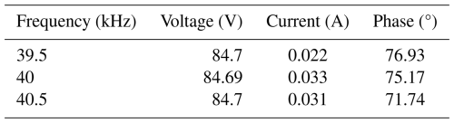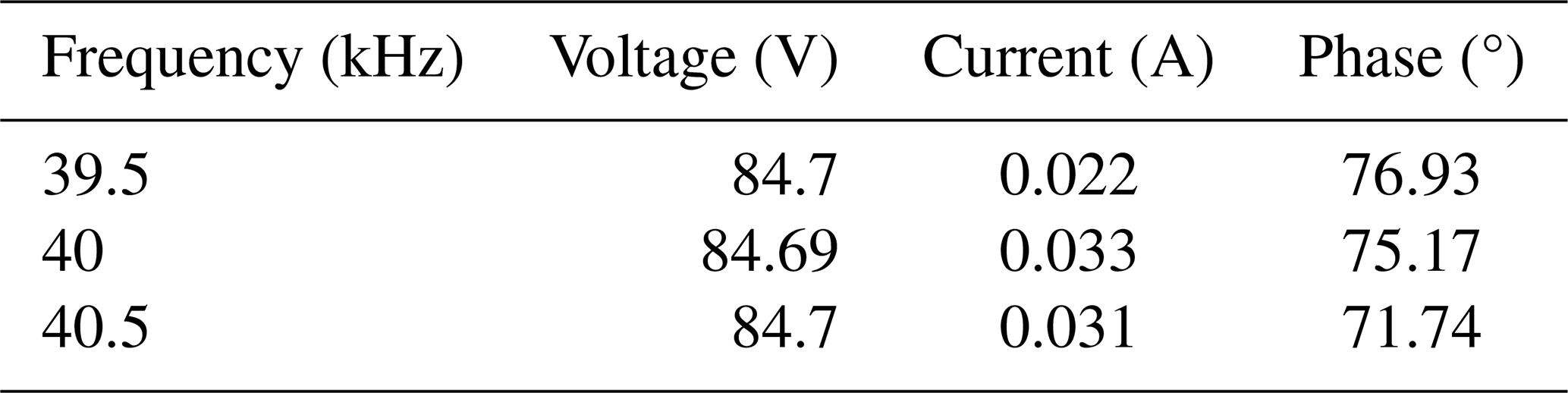 This difference is mainly due to the small-signal measurement condition of the impedance analyzer and the power-driven operating condition used in the proposed method. Considering the fact that the transducer design frequency is 40 kHz, three theoretical calculation frequencies around this frequency – 39.5, 40, and 40.5 kHz – are selected to measure their voltage and current phase data. The measurement results are shown in Table 2.