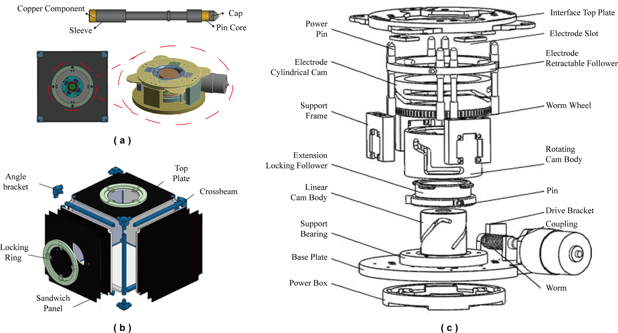 Modular units and interface devices, as core components of reconfigurable spacecraft, play an irreplaceable role in spacecraft assembly, reconfiguration, maintenance, and servicing – their performance directly governs mission flexibility and reliability. This paper presents a full-process investigation into modular units and interface devices, covering design, optimization, and verification. First, structural and functional designs were completed: the interface principle based on a composite cylindrical cam mechanism was detailed, and key components (e.g., power pins, motor slots) were integrated to enable mechanical locking and electrical signal transmission. Second, to mitigate transmission errors, the follower motion law was optimized by adopting the optimized quadratic-modified uniform-velocity motion law, which enhances transmission smoothness. Subsequently, dynamic analysis and experimental verification were conducted. The vertical lift distances of the locking-extending helical follower and the power-connecting electrode telescopic follower were measured to be 21.8 and 8 mm, respectively. Comparative simulations of the peak roller–groove collision forces under two distinct motion laws verified the rationality of the adopted motion law. Further verification via ADAMS software modeling and prototype tests confirmed the engineering feasibility of locking and power pin docking functions. Finally, a series of tests – including robotic arm docking, mechanical (tensile load: 6000 N; compressive load: 400 N), high- to low-temperature (−50 to +70 °C), and signal transmission tests – systematically verified the interface’s comprehensive reliability in rapid precise docking, extreme load/environmental adaptation, and low-loss high-fidelity electrical/data transmission.