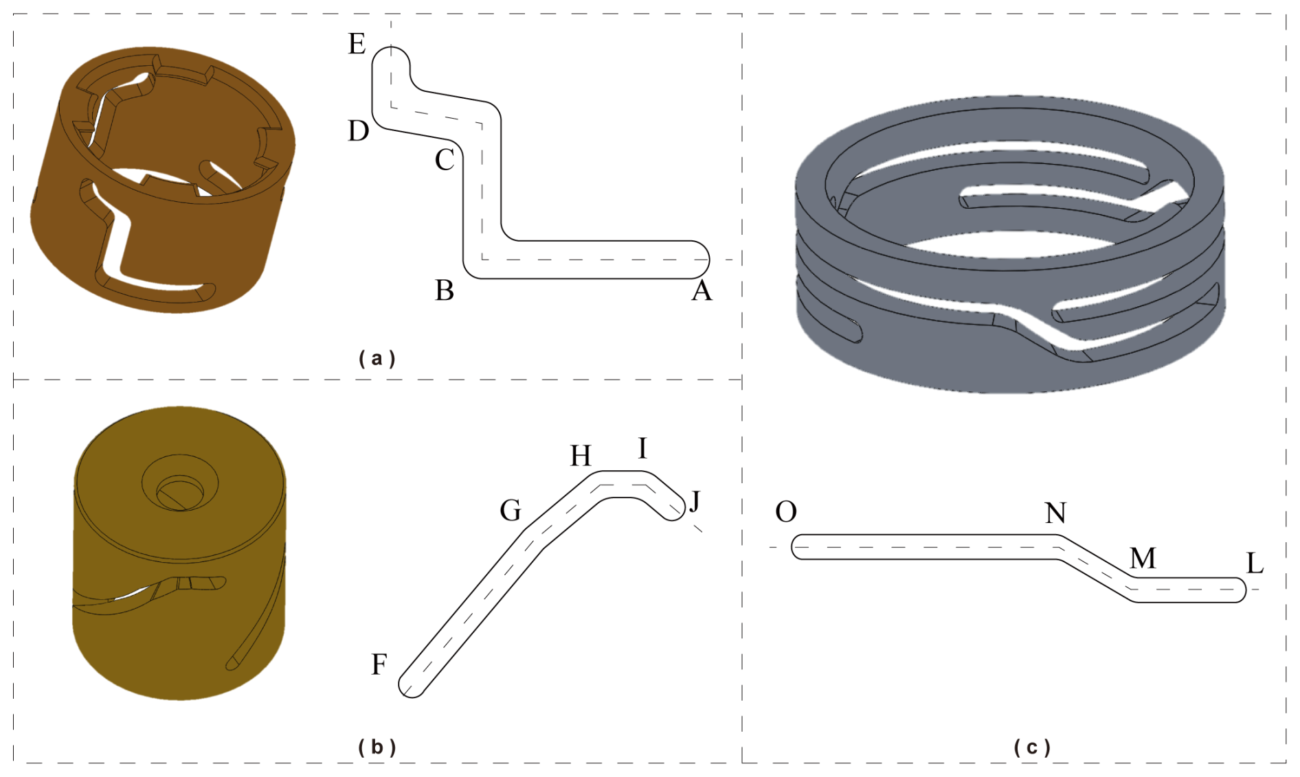 Figure 3Schematic of cam body model and its contour trajectory: (a) rotating cam body, (b) linear cam body, and (c) electrode cylindrical cam body.