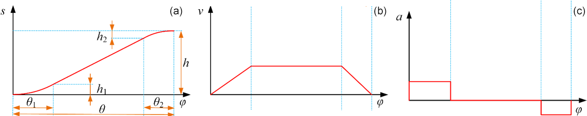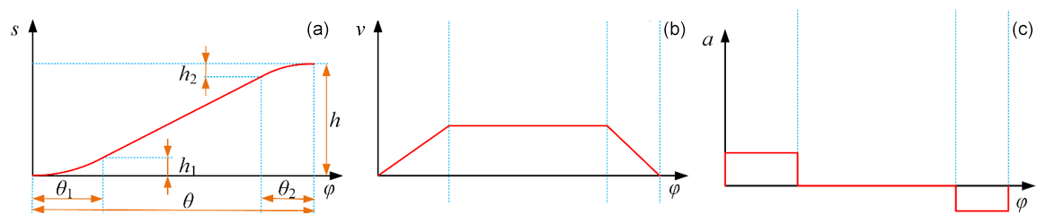Here s is displacement; v is velocity; a is acceleration; J is jerk; θ is the total rise angle; θ1 and θ2 are the cam angles for the acceleration and deceleration phases of the rise, respectively; h is the total rise lift; h1 and h2 are the lifts for the acceleration and deceleration phases, respectively; and ϕ is the cam rotation angle. To ensure that the displacement curve is continuously differentiable and the velocity curve is free of discontinuities, θ1, θ2, h1, and h2 must satisfy the following conditions:
