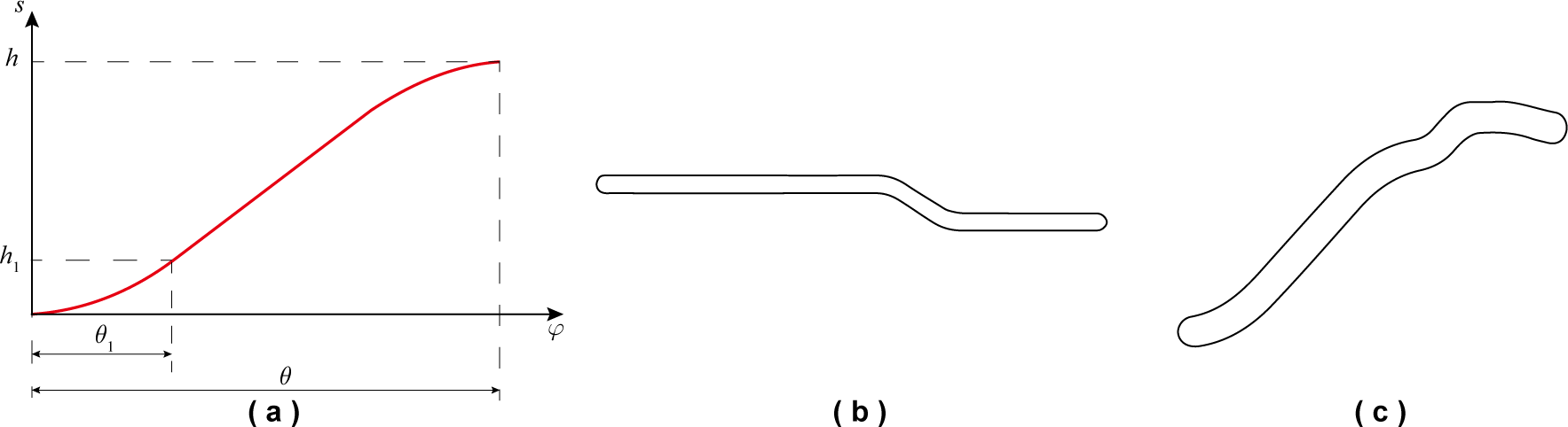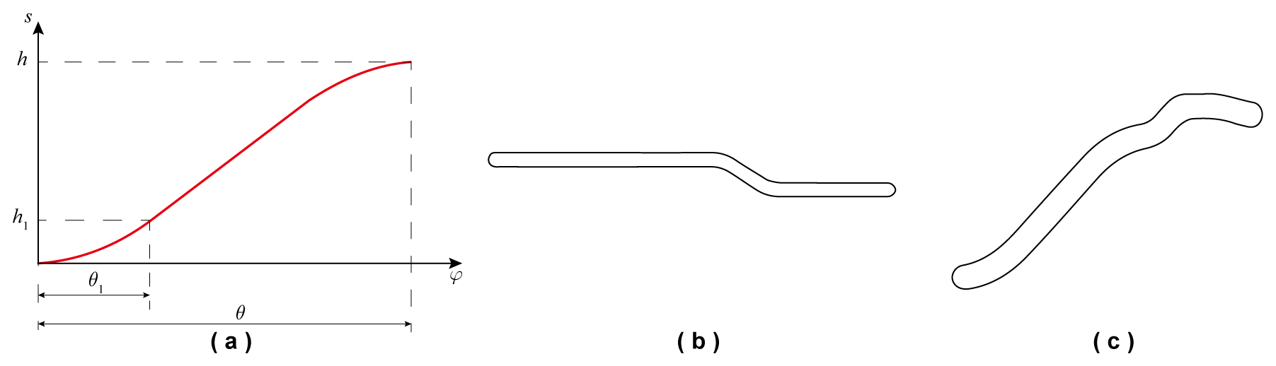 Figure 5Cam optimization design: (a) schematic of optimized displacement curve, (b) curved groove of electrode cylindrical cam, and (c) curved groove of linear cam.