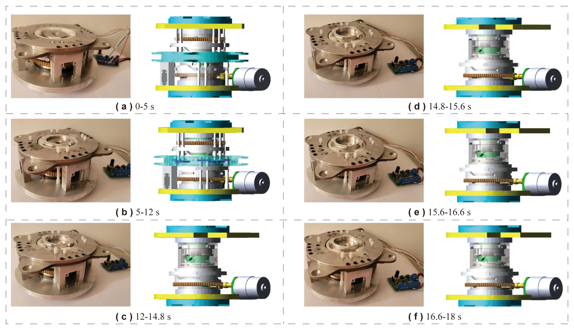 The interface connection process consists of six sequential stages. The first stage (0–5 s) is the initial alignment phase. As shown in Fig. 6a, the passive interface remains stationary while the rotating cam on the active interface rotates 50° under drive actuation. Both the extension-engagement follower and the electrode telescopic follower remain stationary, resulting in a 50° angular offset between the rotating cam and the extension-engagement follower. The second stage (5–12 s) involves positioning and initial insertion, as shown in Fig. 6b. Between 5 and 8 s, the electrode cylindrical cam drives the electrode telescopic follower upward by 8 mm to its highest position, enabling the power pins to engage the electrode slots and complete electrical alignment. Thereafter, the power pins remain fixed at this elevated position. From 5 to 12 s, the rotating cam rotates an additional 70°, causing the extension-engagement follower to rotate 70° and rise approximately 19 mm vertically, positioning it about 3 mm above the top plate. It should be noted that minor deviations in the actual vertical travel of the extension-engagement follower from the designed value of 19 mm occur due to slight geometric alterations in the cam groove profile resulting from file format conversion during model import; however, these deviations remain within acceptable limits. The third stage (12–14.8 s) corresponds to pre-locking preparation, as shown in Fig. 6c. During this phase, the power pins remain stationary, and for clarity of visualization, non-moving components are hidden in the figure. The rotating cam rotates 28°, driving the extension-engagement follower to rotate 8° and creating a 20° angular offset relative to the cam, while the follower ascends a further 2 mm vertically. The fourth stage (14.8–15.6 s) is the locking ascent phase, as shown in Fig. 6d. The rotating cam and the extension-engagement follower rotate synchronously by 8°, and the locking blade rises with the follower by about 2 mm to its highest position. The fifth stage (15.6–16.6 s) is the locking hold phase, as shown in Fig. 6e, during which the rotating cam and the follower rotate together by 10°, with the follower maintaining its maximum vertical height. The sixth and final stage (16.6–18 s) is the final compression phase, as shown in Fig. 6f. Here, the rotating cam and the follower rotate together by 14°, while the follower descends approximately 1.2 mm vertically. This downward movement presses the active locking blade firmly against the passive locking blade, thereby completing the rigid locking connection between the active and passive interfaces. The resulting displacement curves of the extension follower and the electrode telescopic follower obtained from the simulation are shown in Fig. 7, respectively.