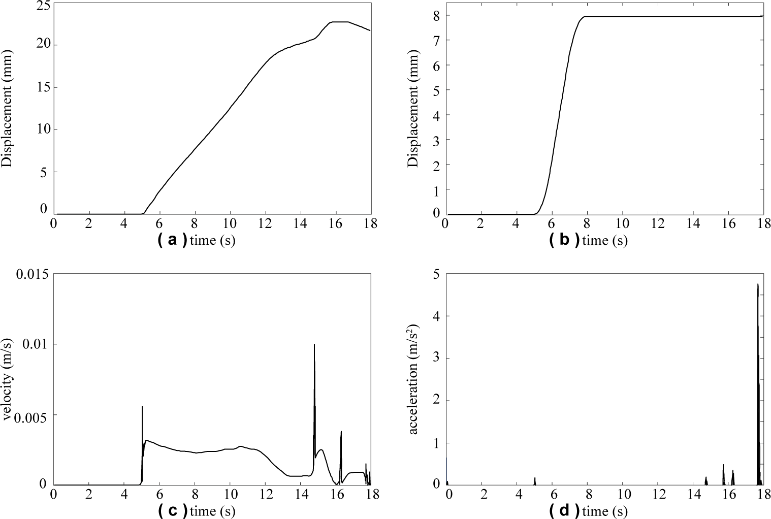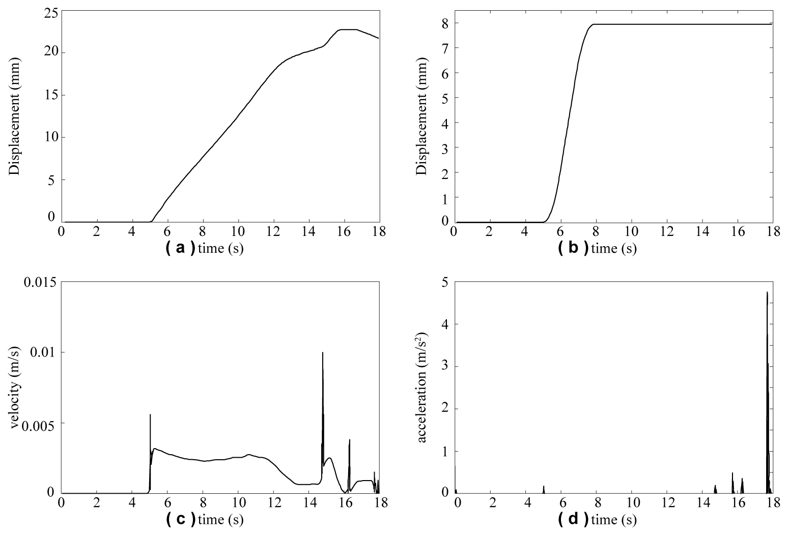 Figure 7Motion curves of key interface components: (a) Centroid displacement curve of extending and screwing follower, (b) centroid displacement curve of electrode telescopic follower, (c) velocity curve of extending and screwing follower, and (d) acceleration curve of extending and screwing follower.
