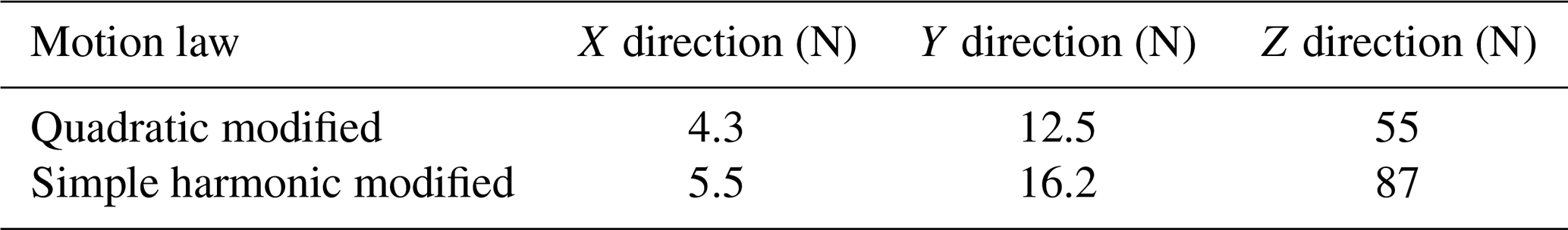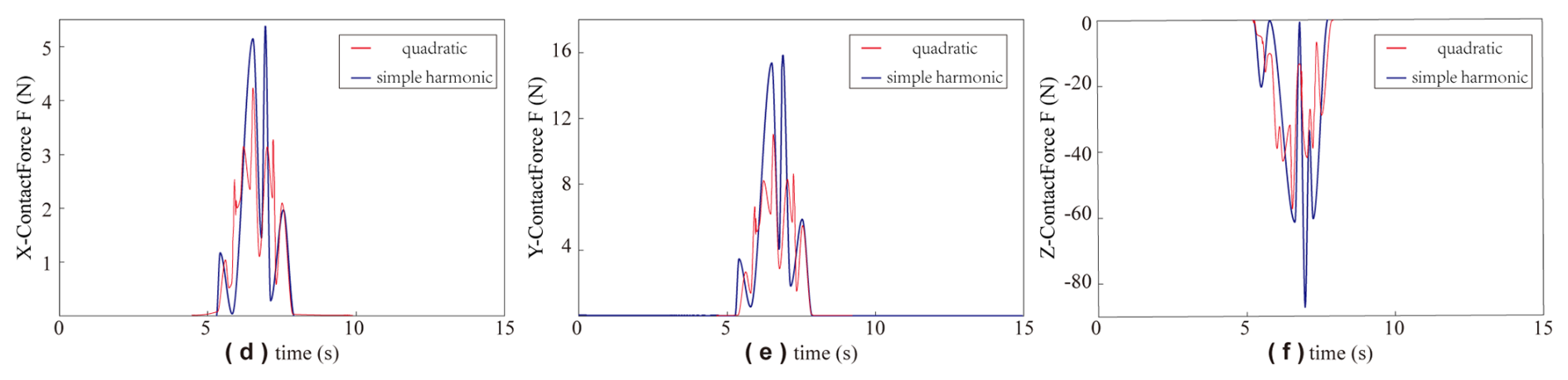 A comparative analysis of the peak collision forces corresponding to the two optimized motion laws demonstrates that the quadratic-modified law achieves lower peak forces across all three directional degrees of freedom. The magnitude of the peak collision force directly characterizes the intensity of impact loads and inertial effects acting between the cam groove and the roller. Lower peak values correspond to mitigated impact and inertial forces, which are conducive to minimizing contact wear and prolonging the service life of the mechanism. Therefore, in terms of reducing contact collision forces and suppressing mechanism wear, the optimized quadratic-modified constant-velocity motion law presents more excellent dynamic performance.