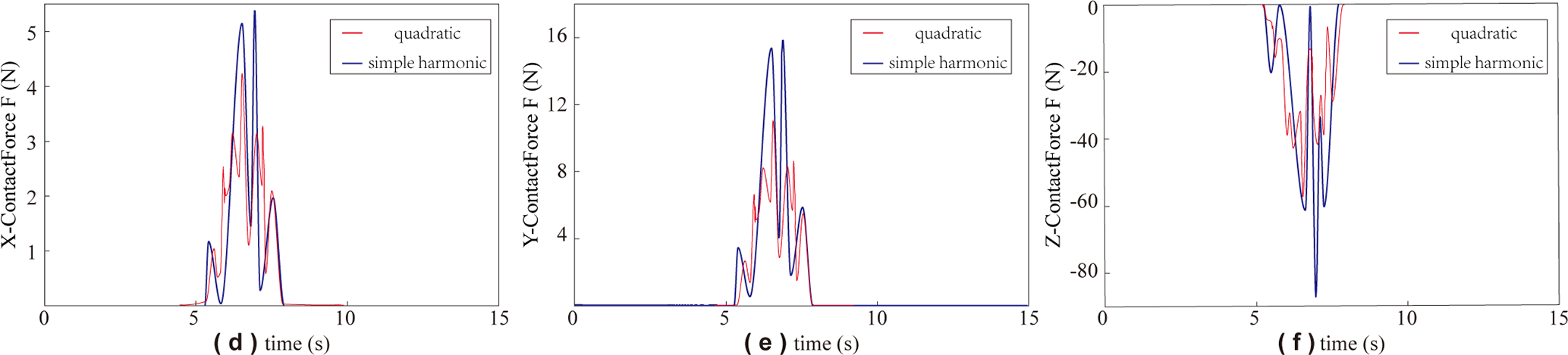 For the electrode cylindrical cam mechanism, dynamic simulations were conducted using the optimized constant-velocity motion law with quadratic modification and the optimized constant-velocity motion law with simple harmonic modification, respectively, to determine the contact collision forces between the roller and the cam groove profile along the X, Y, and Z directions. Figure 8a–c show the collision forces under the optimized quadratic-modified constant-velocity motion law, while Fig. 8d–f present the results under the optimized simple harmonic-modified constant-velocity motion law. The simulation results indicate that, under the optimized quadratic-modified constant-velocity motion law, the maximum contact collision forces between the roller and the groove in the X, Y, and Z directions are 4.3, 12.5, and 55° N, respectively. To further evaluate the influence of the motion law on contact performance, a comparative analysis was performed using the optimized simple harmonic-modified constant-velocity motion law. The results show that the corresponding maximum collision forces in the X, Y, and Z directions are 5.5, 16.2, and 87° N, respectively.