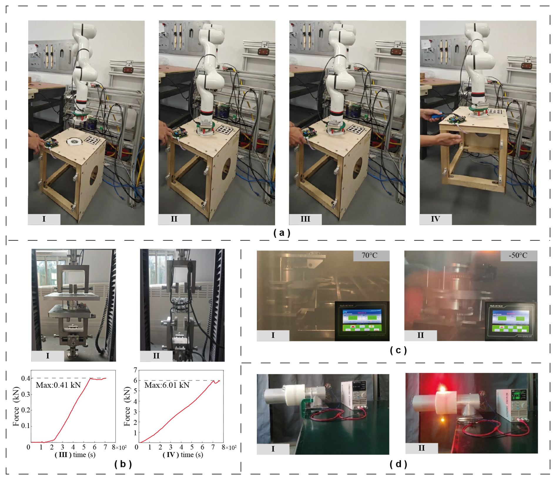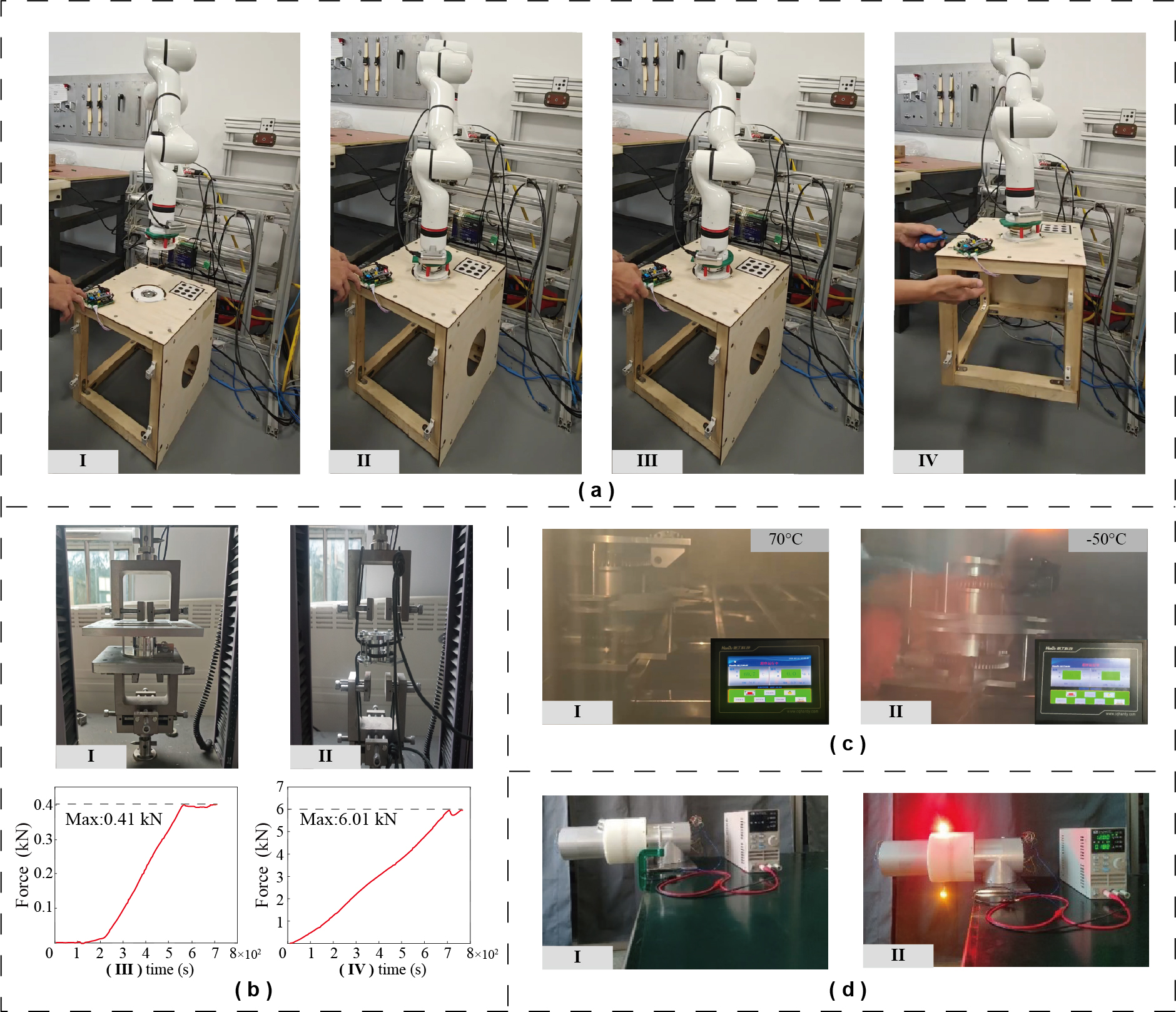 Figure 9Interface reliability tests: (a) robotic-arm-reconfigurable module docking test, (b) mechanical performance test, (c) high- to low-temperature docking test, and (d) interface signal transmission test.
