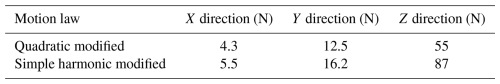 The peak collision forces between the roller and the cam curve groove in the X, Y, and Z directions are summarized in Table 1. As indicated in the table, when the optimized quadratic-modified constant-velocity motion law is employed, the peak collision forces in all three directions are consistently lower than those obtained with the optimized simple harmonic-modified constant-velocity motion law. Lower collision forces contribute to reduced wear between the cam groove and the follower, thereby minimizing transmission errors in the interface. These results validate the appropriateness of the selected motion law for the follower mechanism.