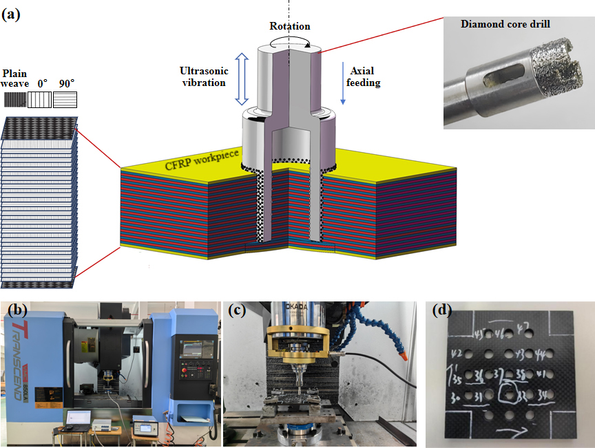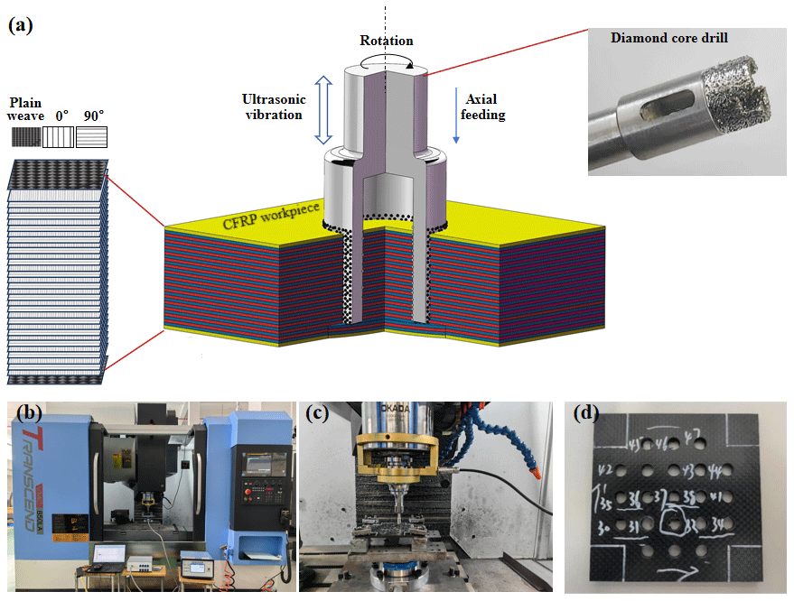 To enhance the quality and efficiency of drilling CFRP laminates, researchers have developed improvements upon traditional drill bits primarily by optimizing structural parameters such as the nose edge (Lazar and Xirouchakis, 2011), point angle (Durão et al., 2010), stepped cutting edge (Xia and Mahdavian, 2005), or double-point angle (Henerichs et al., 2015). These modifications aim to control the axial force below the critical threshold, thereby suppressing exit-side delamination damage. Building on this, Priarone et al. (2017) investigated the performance of a coreless diamond core drill based on the concept of “drilling by grinding”. It was concluded that this approach significantly reduces axial force and temperature, effectively mitigating machining damage in composites; however, its machining efficiency remains relatively low. Studies by Lv et al. (2021) and Lotfi et al. (2022) indicated that rotary ultrasonic-assisted drilling (RUD) enables high-frequency vibration of the tool during grinding, which periodically removes material and alters the material removal process. The studies by these two researchers primarily focus on the advantages of ultrasonic-assisted machining, with a relatively singular research objective. However, in actual machining processes, optimizing and improving a single defect make it challenging to identify the optimal process parameters. Shard et al. (2023) conducted ultrasonic-assisted drilling experiments on CFRP using a twist drill and a diamond core drill. The results demonstrated that under ultrasonic assistance, the use of a diamond core drill significantly reduced delamination defects compared to non-ultrasonic drilling. Similarly, Geng et al. (2020) performed ultrasonic-assisted drilling experiments on CFRP with a diamond core drill and found that the hole quality at both entry and exit sides was superior with ultrasonic assistance, leading to better overall hole machining quality. Evidently, compared with conventional drilling processes, RUD offers distinct advantages, including reduced axial force, lower grinding temperature, improved chip evacuation, suppressed delamination, better surface roughness, and higher drilling accuracy.