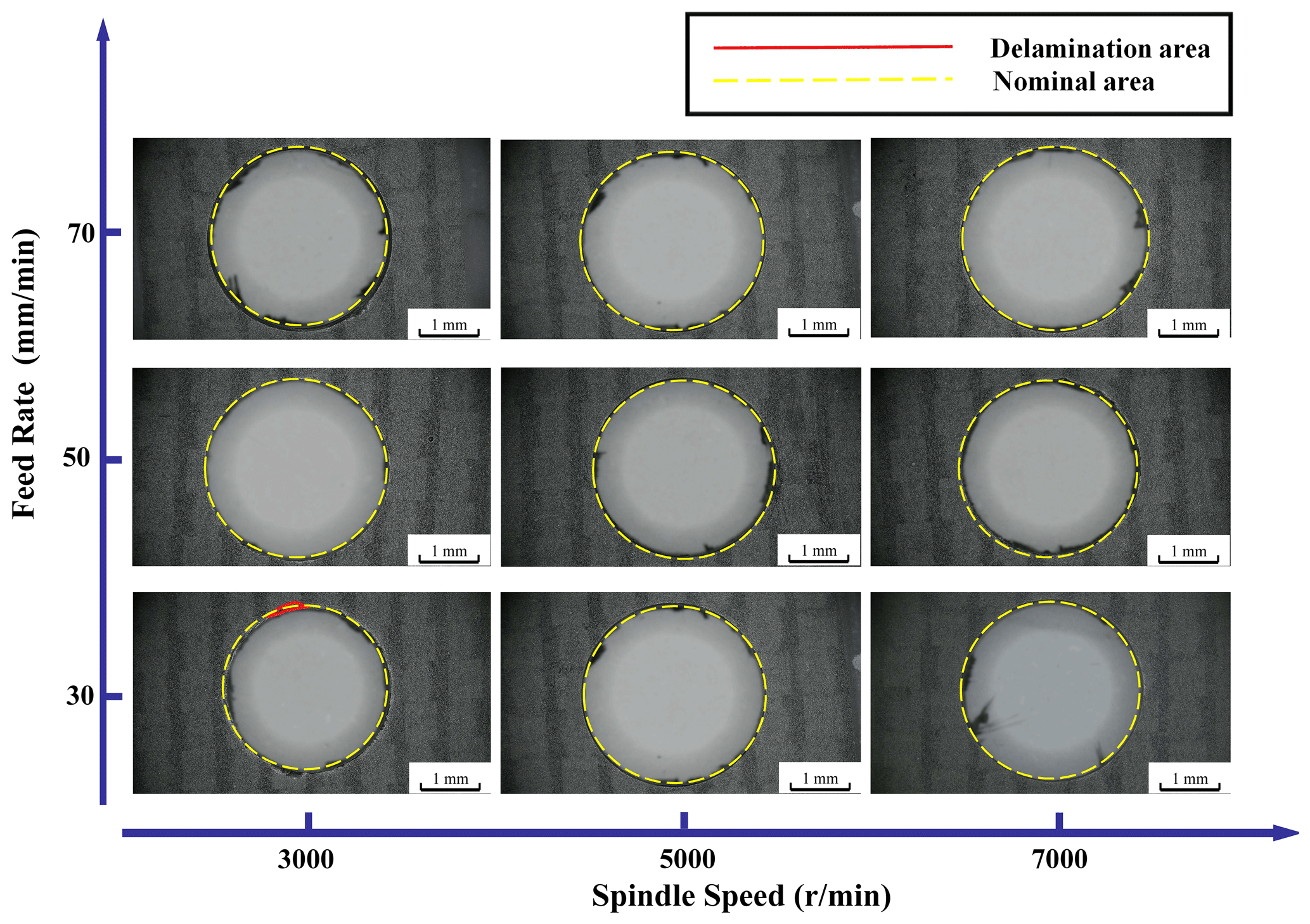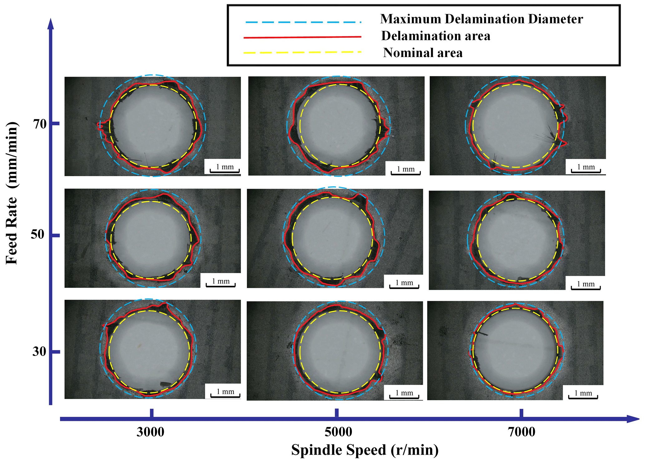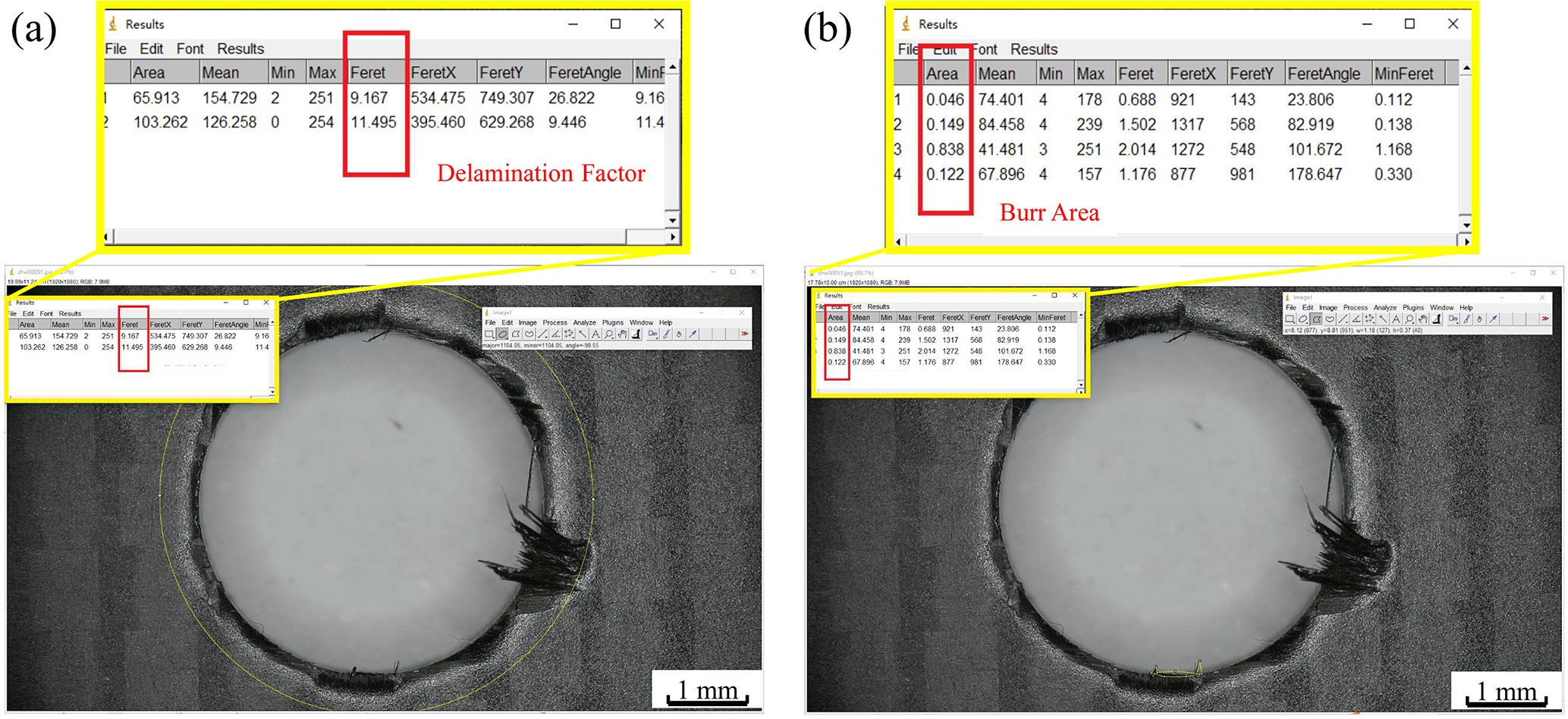 In the equations, Fd represents the delamination factor, Dmax is the maximum defect diameter, and D is the preset hole diameter.