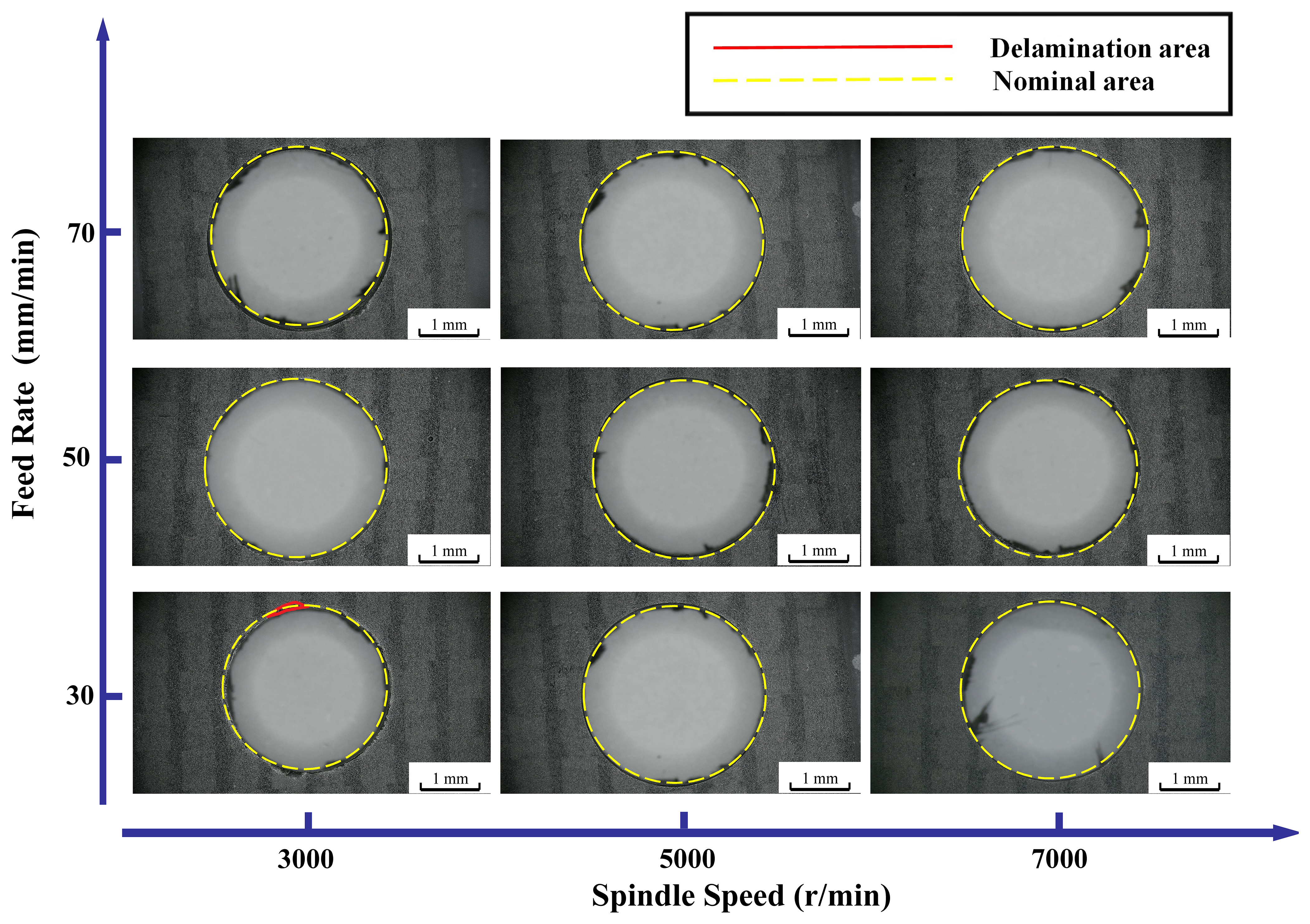 Experimental results demonstrate that increasing the spindle speed (7000 r min−1), reducing the feed rate (30 mm min−1), and employing a tool with a small grit number (60 grits) significantly reduce exit delamination and burr formation. Response surface analysis reveals that the feed rate and tool grit number exert the most substantial influence on defects, and their interaction intensifies both delamination and burr generation.