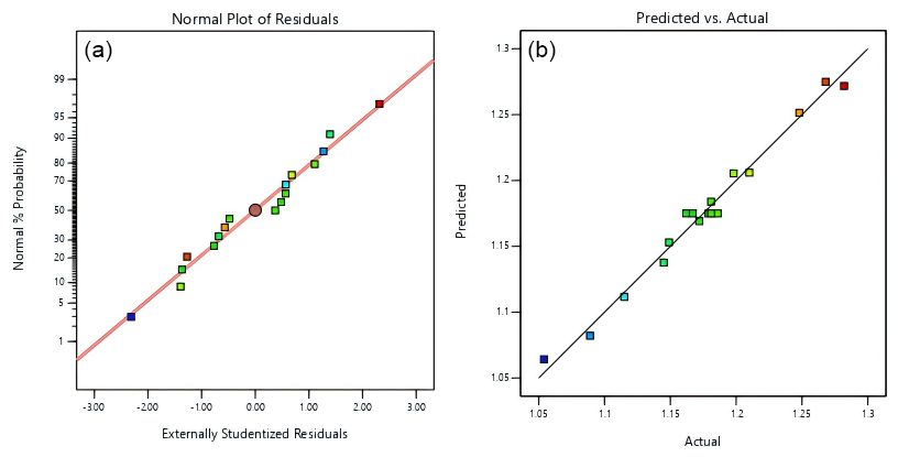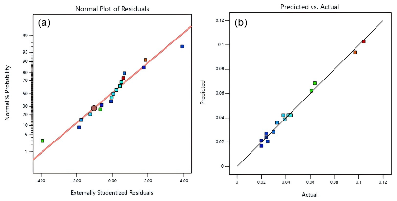 Subsequently, residual plots are generated using the experimental design software for diagnostic purposes. The goodness of fit between the model and the data is evaluated by analyzing the absolute values of the residuals. Standardized residuals are commonly employed to eliminate the influence of measurement units; however, they fail to eliminate the impact of K–T transformation. This study adopts studentized deleted residuals as a replacement for standardized residuals, which provides a more intuitive assessment of whether the error terms conform to a normal distribution and contributes to the optimization of the linear regression model (Jones and Nachtsheim, 2017). Its expression is as follows: