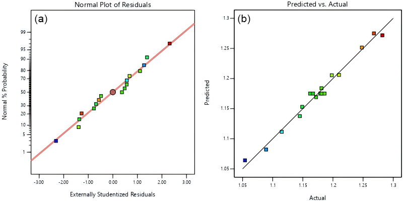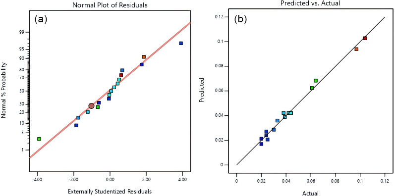 Figure 7Comparison between experimental and predicted results for delamination factors. (a) Normal probability plot of residuals, (b) experimental vs. predicted values.