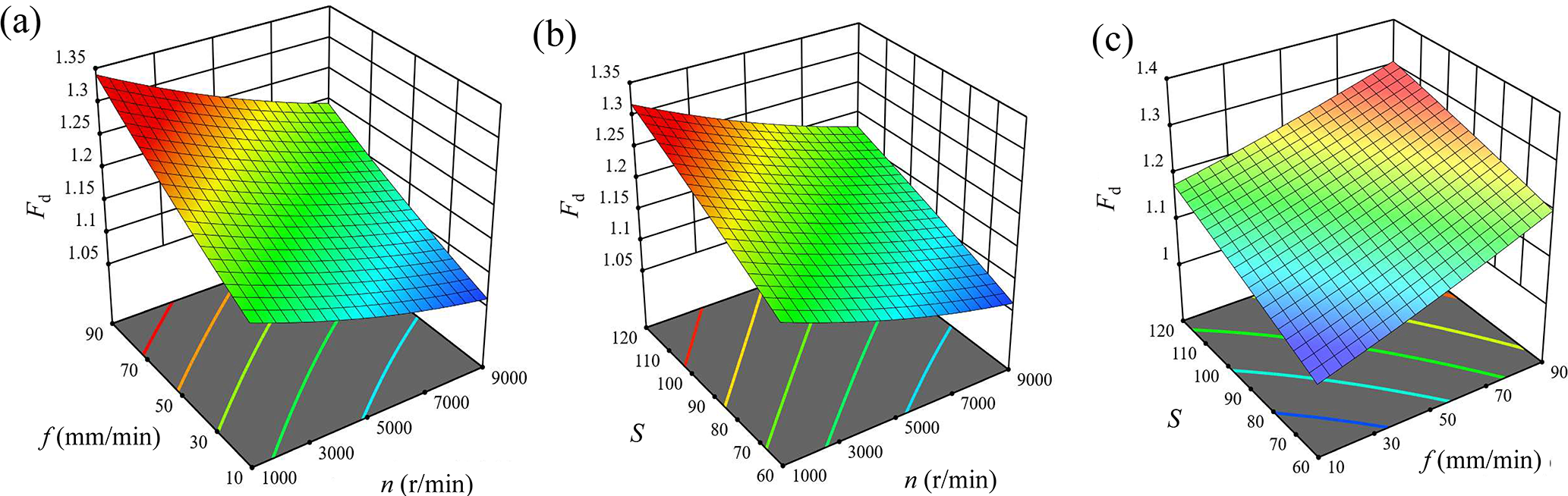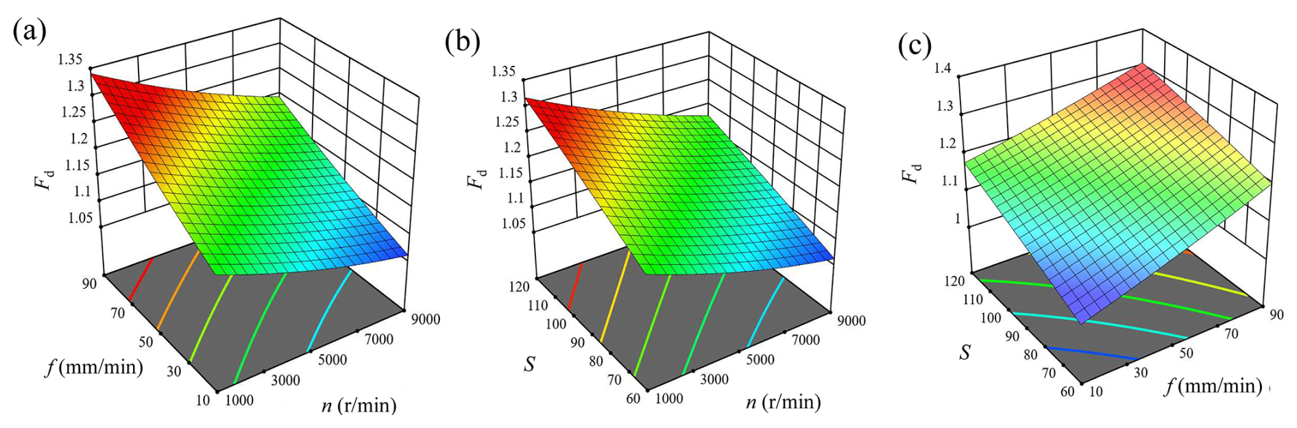 Based on the experimental data, the second-order nonlinear fitting equation for the influence of process parameters on the exit delamination factor (Fd) in CFRP grinding drilling is given as follows: