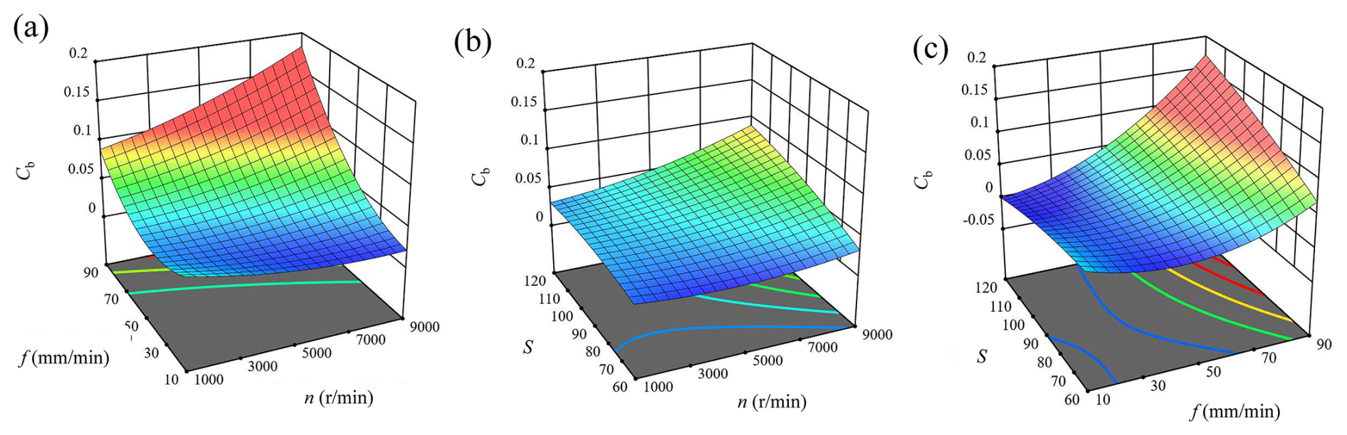 Based on the experimental data, the second-order nonlinear fitting equation for the influence of process parameters on the exit burr factor (Cb) in CFRP grinding drilling is given as follows: