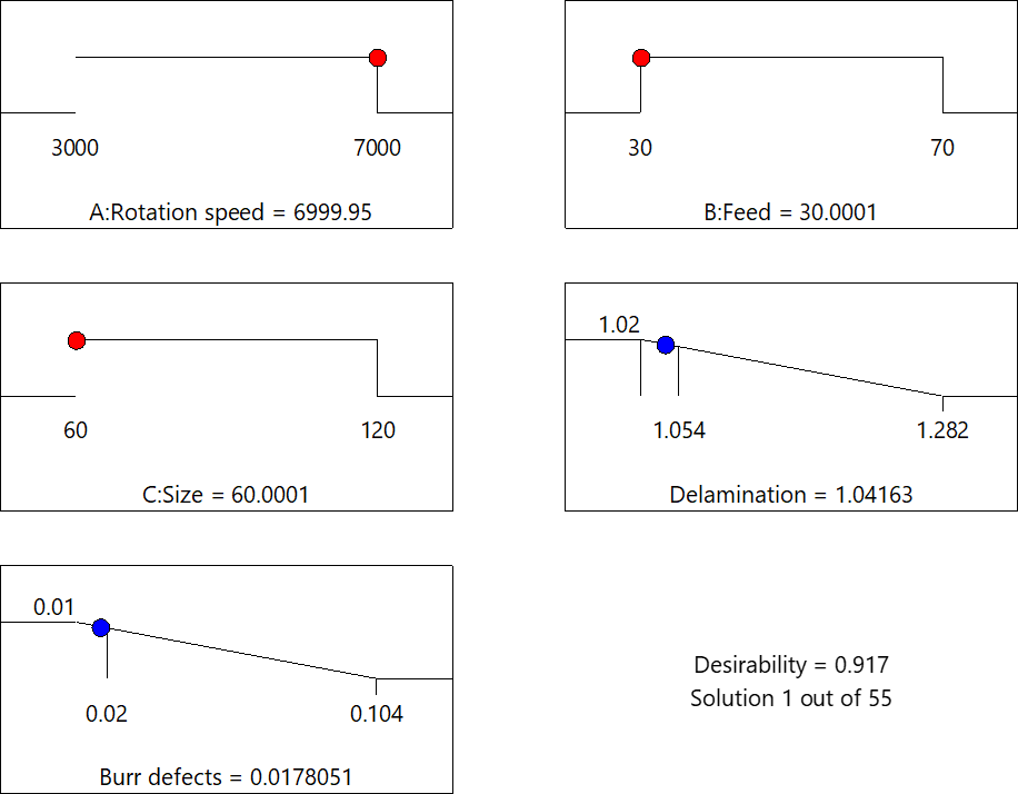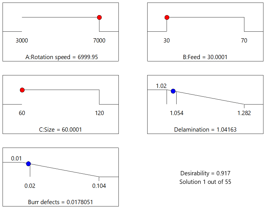 Figure 12 presents the multi-objective optimization results integrating both exit delamination defects and burr defects. It can be observed that when the spindle speed is 6999.95 r min−1, the tool feed rate is 30.0001 mm min−1, and the tool grit number is 60.0001 grit, the exit delamination factor of the CFRP hole reaches its minimum value of 1.0416, while the burr coefficient achieves its minimum value of 0.0178. The desirability of the model is 0.917, approaching 1.0, indicating that the optimization results of the multi-objective model exhibit high accuracy.