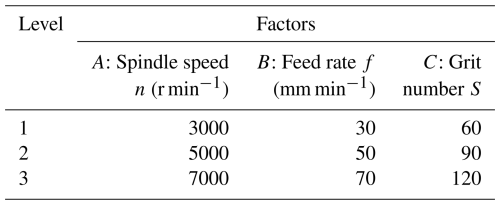 Figure 8a shows the interaction plot between spindle speed and tool feed rate at a fixed tool grit number. It can be observed from the figure that the delamination factor exhibits a negative correlation with spindle speed and a positive correlation with tool feed rate. Additionally, spindle speed and tool feed rate demonstrate an approximately linear relationship; however, their interaction contributes less than 5 % to the exit delamination factors, indicating that the interactive effect between spindle speed and tool feed rate has no significant influence on exit delamination. Furthermore, the results reveal that between spindle speed and feed rate, the feed rate exerts a greater influence on exit delamination. When the spindle speed is 3000 r min−1 and the feed rate increases from 30 to 70 mm min−1, the exit delamination factor increases by 6.5 %. Similarly, when the spindle speed is 7000 r min−1 and the feed rate increases from 30 to 70 mm min−1, the exit delamination factor rises by 5.9 %. Therefore, employing a lower feed rate is an effective approach to reduce exit delamination factors.