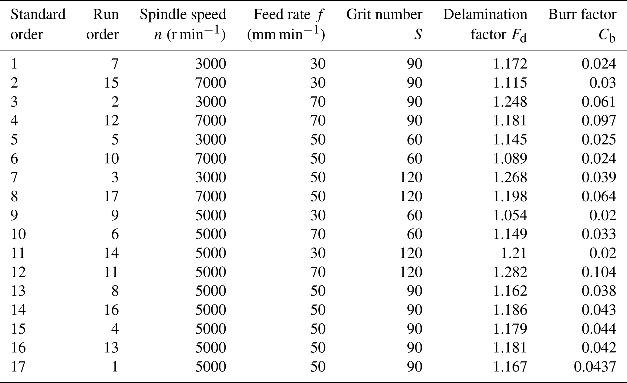 The optimal parameter combination obtained through multi-objective optimization is n = 7000 r min−1, f = 30 mm min−1, and S = 60 grit. The delamination factor and burr coefficient are reduced to 1.047 and 0.016, respectively, closely aligning with the model predictions. These research results provide actionable process guidance for high-precision drilling of CFRP components in engineering applications.