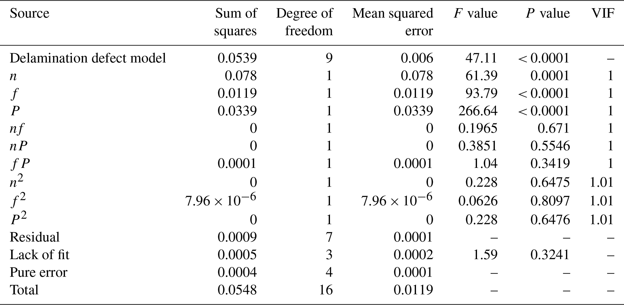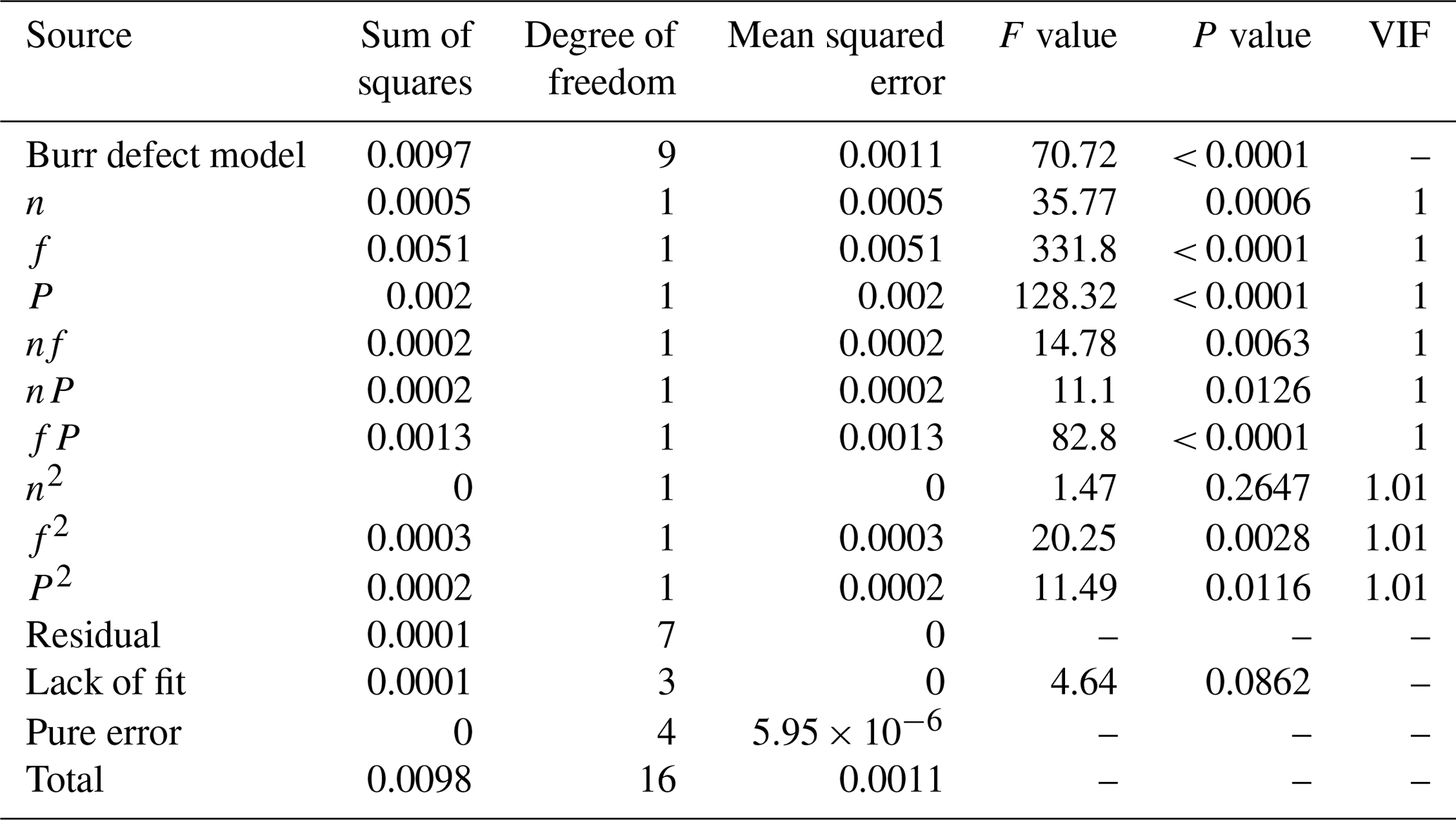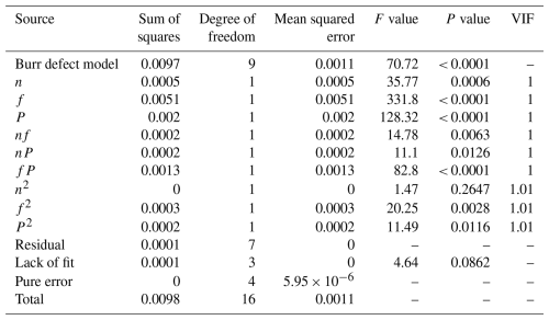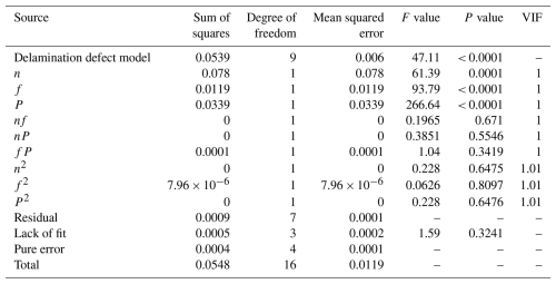 Table 3 presents the ANOVA results for the delamination defect model. The variance inflation factor (VIF) for each coefficient in the model falls between 1 and 1.01, which is well below the threshold of 5. This indicates that there is no significant multicollinearity among the independent variables, and the control of collinearity in the model is effective. The significance of the model depends on the F value (the ratio of the model's mean square to the residual mean square) and the P value. A larger F value and a smaller P value indicate a more significant effect. As can be seen from Table 3, the model's F value is 47.11, and the P value is less than 0.0001, indicating that the model is effective and highly significant. The lack-of-fit P value is 0.3241, which is greater than 0.05 and is not significant, further demonstrating the validity of the model. Furthermore, based on the P values, the contribution of the three main factors to the delamination factor can be evaluated. The spindle speed (n) has the least influence on delamination factors. Both the tool feed rate (f) and the tool grit number (S) have P values less than 0.0001, indicating that they exert a substantial and comparable influence on delamination factors. The influence of the interaction terms on delamination factors, in descending order, is . Analysis of the correlation coefficients shows that the R2 and values are 0.9838 and 0.9629, respectively, both close to 1, indicating a high correlation of the model. The value is 0.8470, and the difference between and is less than 0.2, demonstrating that the model has both a good fit and predictive ability, fully reflecting the rationality of the CFRP grinding drilling experiment. The adequate precision value (the ratio of the standard deviation of the predicted values to the model error) is 24.3448, which is greater than 4, indicating a reasonable model. The coefficient of variation (C.V. %) is 0.9595 %, which is less than 10 %, suggesting a high degree of reliability in the experimental design.