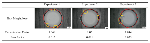 By integrating single-objective and multi-objective optimization models and considering experimental conditions and practical constraints in the drilling process, the optimized combination of process parameters is determined as follows: spindle speed of 7000 r min−1, feed rate of 30 mm min−1, and tool grit number of 60. The CFRP ultrasonic-assisted grinding and drilling experiments are conducted using this parameter set. To minimize experimental errors, three replicate trials are performed under this parameter combination, and the experimental results are averaged. Table 5 presents magnified images of the hole exit from the three experiments under this parameter set, along with quantitative analysis data of exit delamination and burr defects.